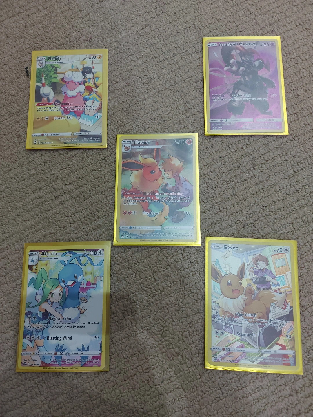 23Selling a set of full art Pokémon TCG cards, including Flareon, Armored Mewtwo, Eevee, Flaaffy, and Altaria! NOTE: cards will be priced differently if chosen to be bought individually