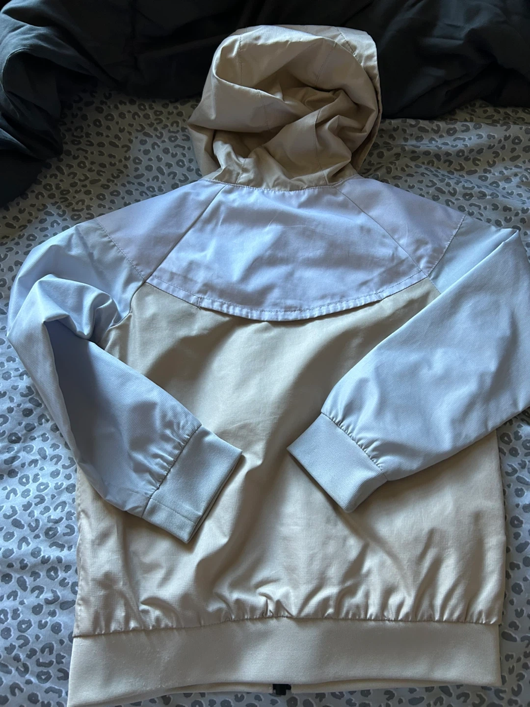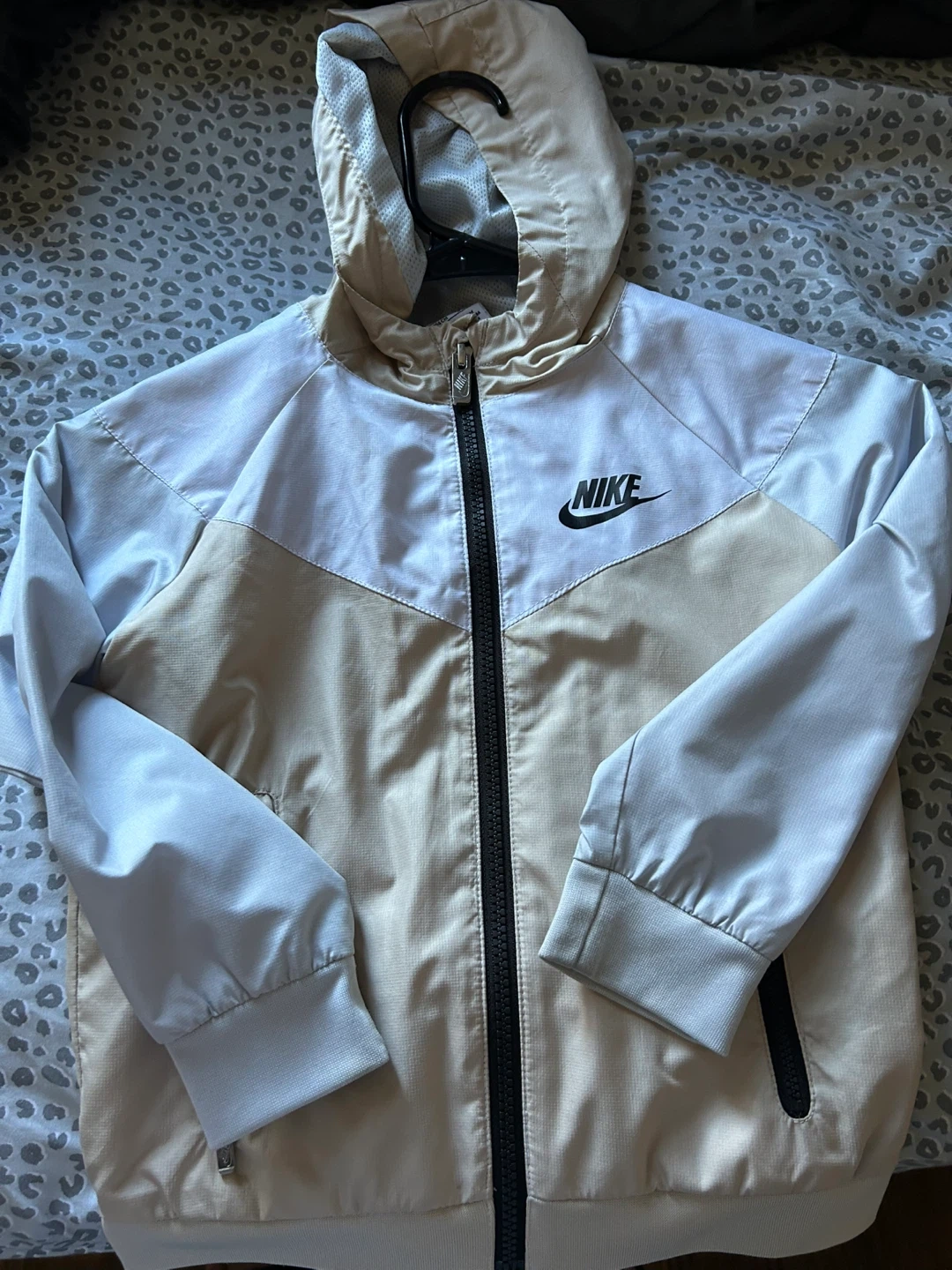 Nike Windrunner jacket in a stylish white and beige colorway. It's perfect for layering or wearing on its own during milder weather. This jacket is lightweight and portable, making it great for outdoor activities or travel. It's in great condition and ready for a new home