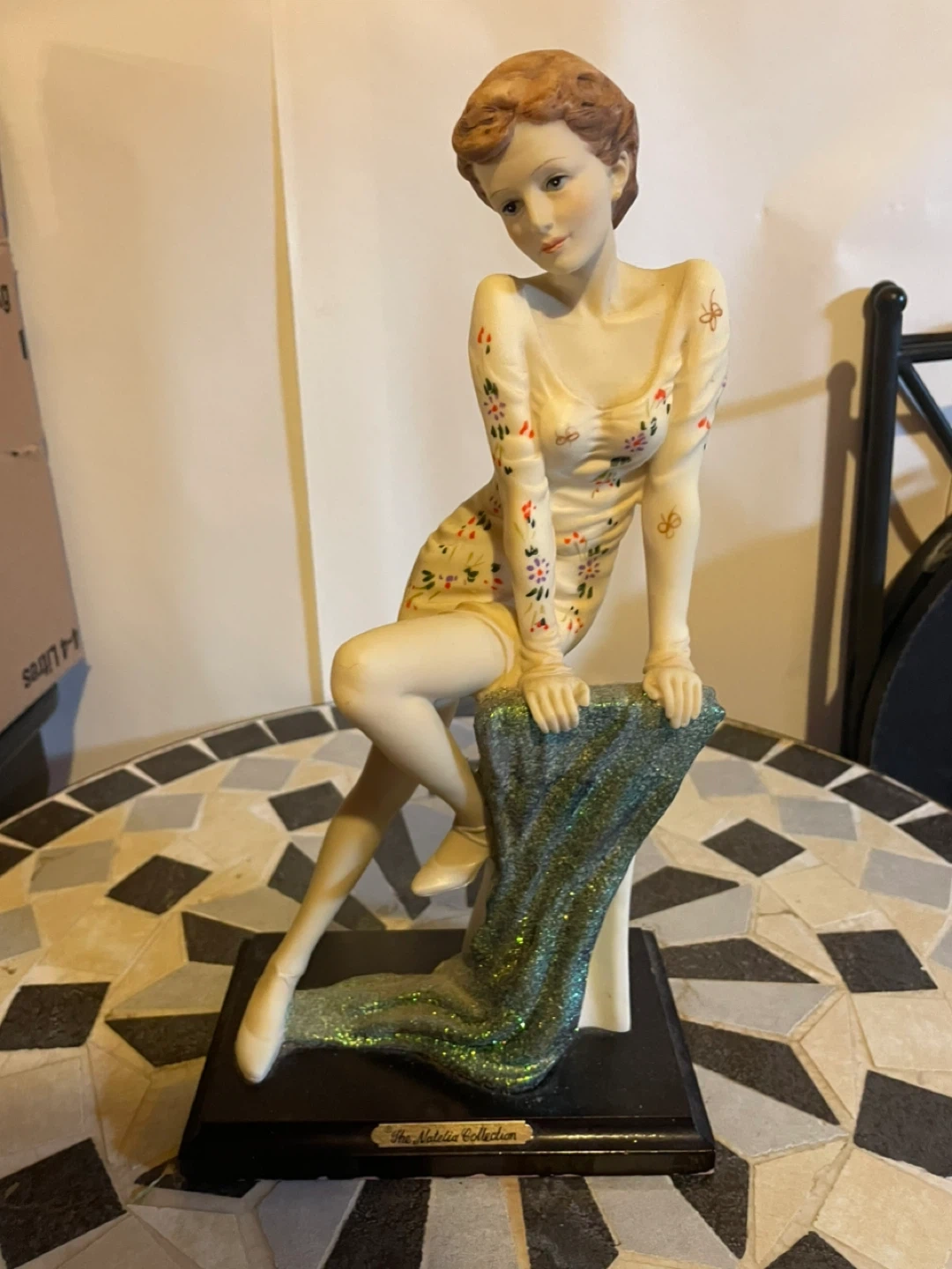 83This is a beautiful figurine from The Natalia Collection. It features a woman in a floral dress sitting on a sparkly green shawl over a stool. It would make a lovely addition to any home! Great condition.