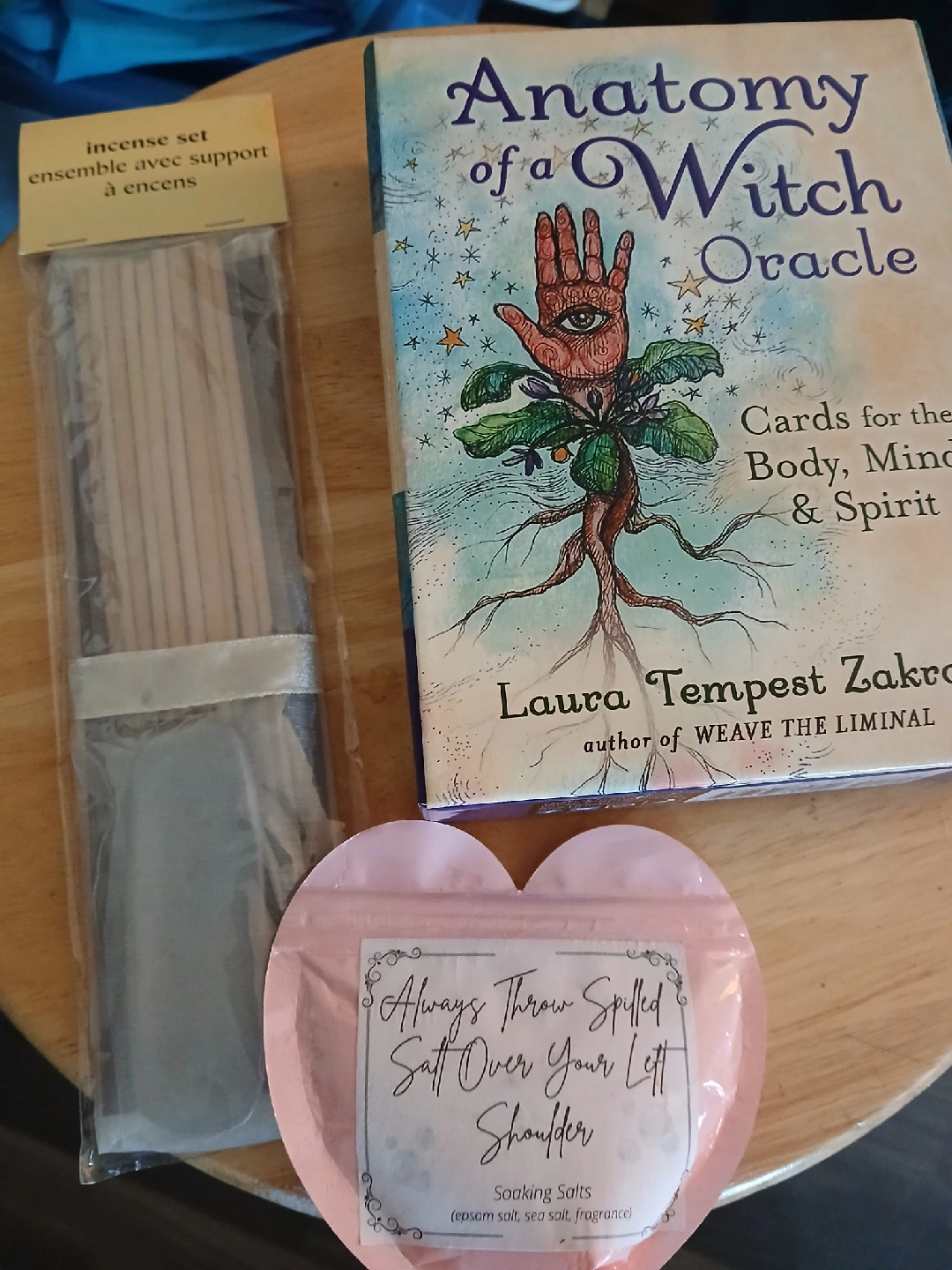 Selling a copy of Anatomy of a Witch Oracle cards by Laura Tempest Zakro. It's a deck of cards for the body, mind, and spirit. Also included is an incense set and soaking salts!