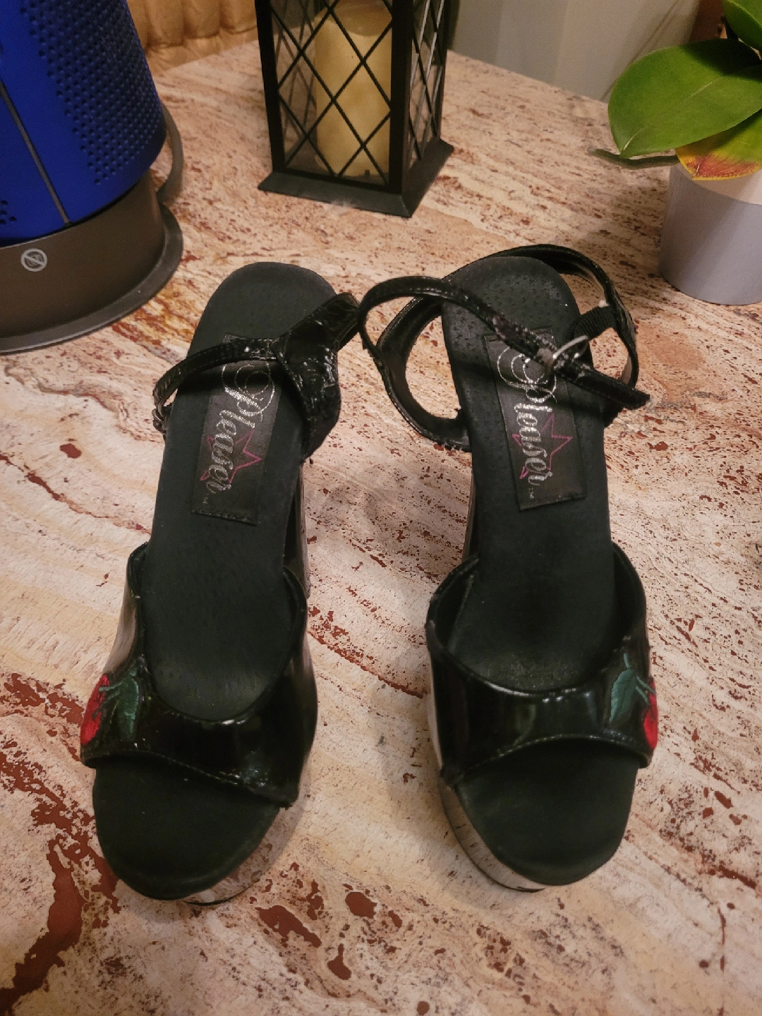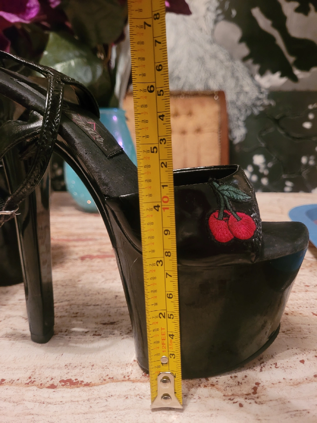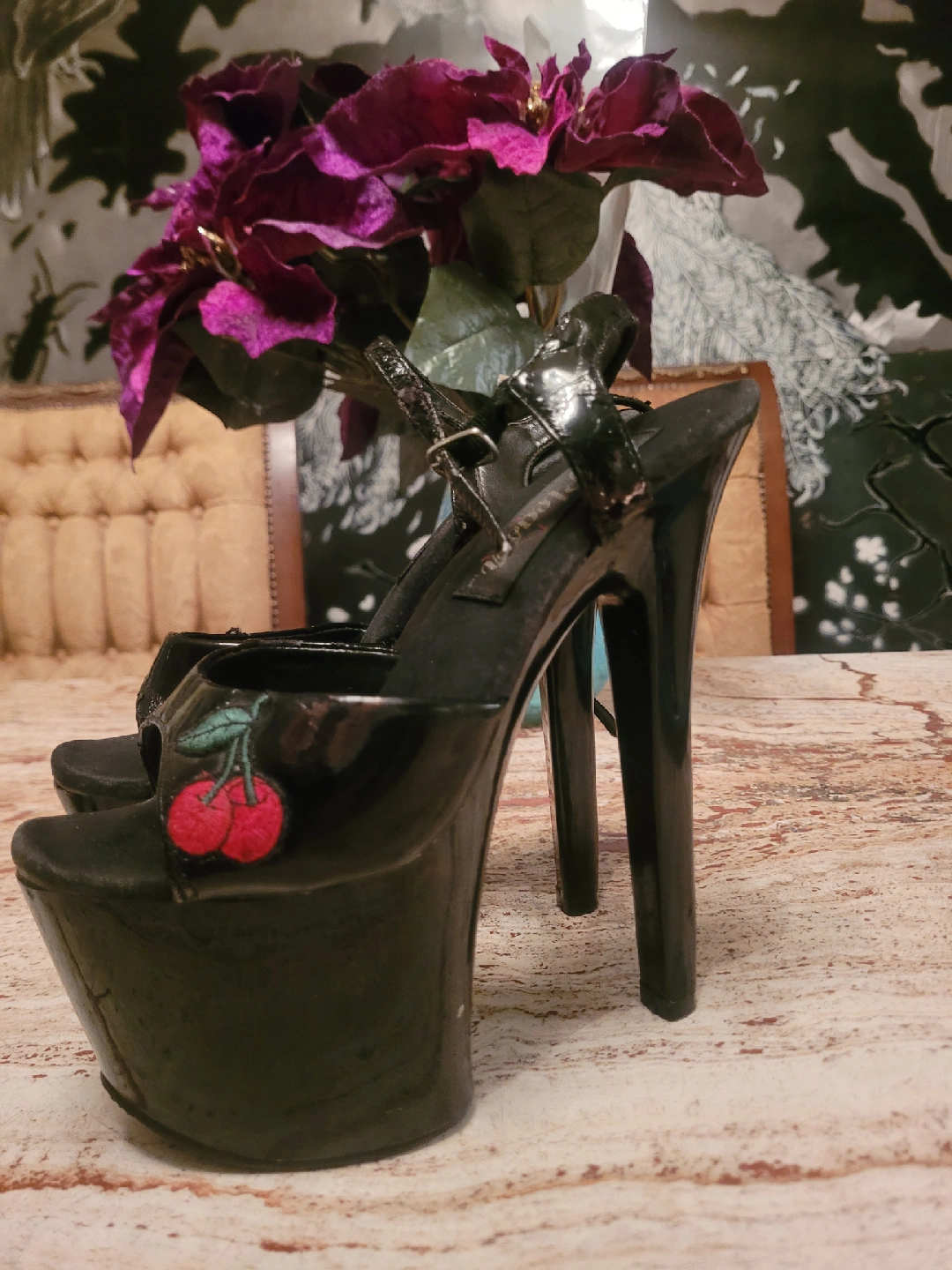 1000+Step up your shoe game with these striking Pleaser heels, perfect for adding a touch of sass to any outfit! These heels are a size 7 and feature an eye-catching cherry design. Being a used item, they have been strutted around in, so they have a bit of wear and tear. * Brand: Pleaser * Size: 7 * Heel Height: Approximately 7 inches * Style: Platform Heels with Ankle Strap * Colour: Black with Red Cherry Accent I've decided to pass these heels on to someone who will love them as much as I have! I f you see this ad, it means these sassy shoes are still waiting to find their perfect match.