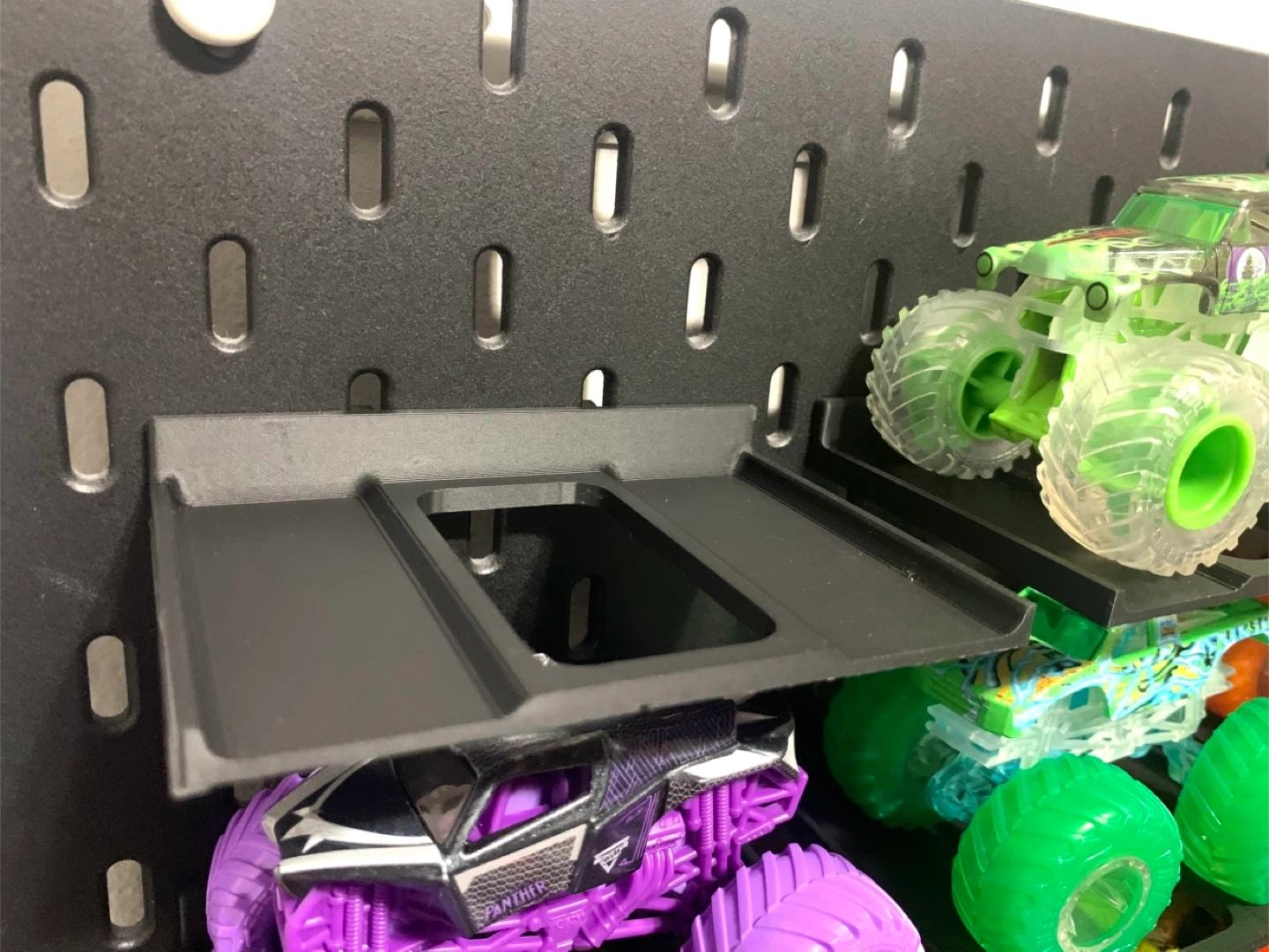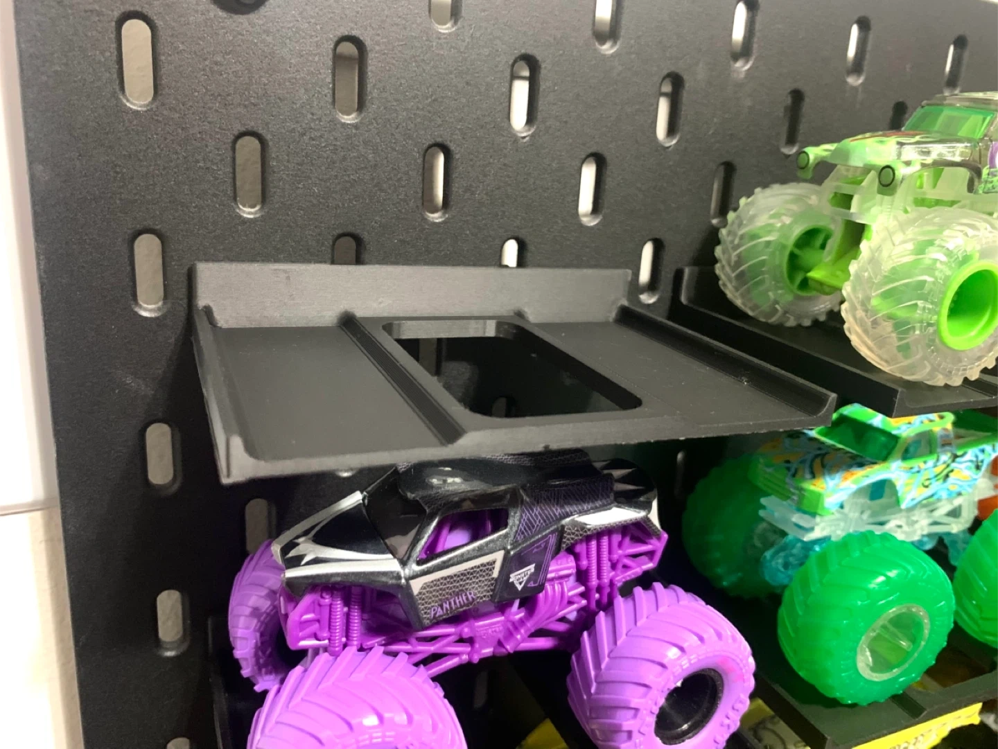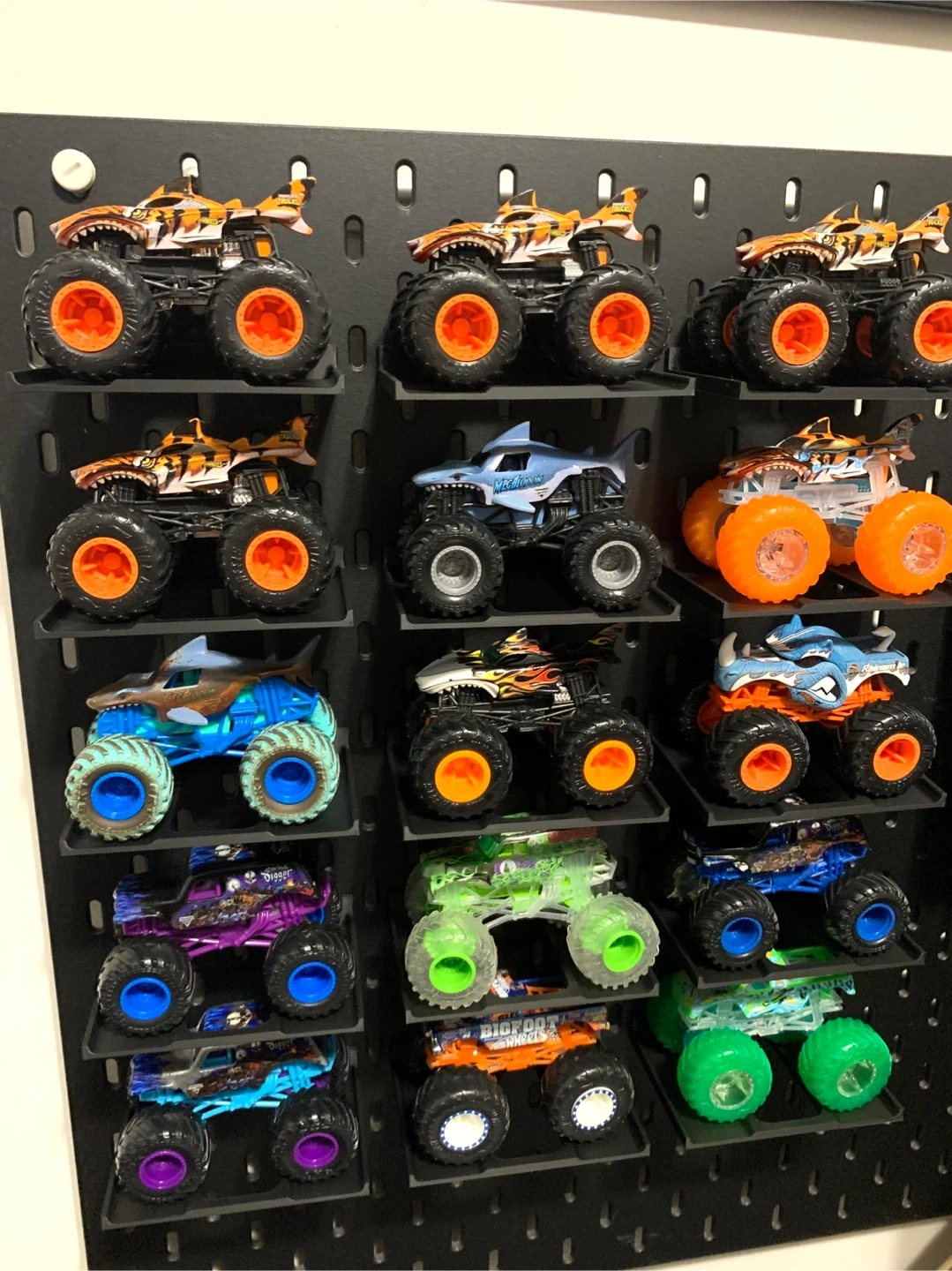 65Holder for Monster Trucks for the Ikea Skadis Board to fill the board would be 36 pieces for $30 but $1 each. 12 pcs for $10 24 pcs for $20 36 pcs $30 Great way to display your monster trucks and have them organized!! No more stepping on the trucks and hurting your ankle!!