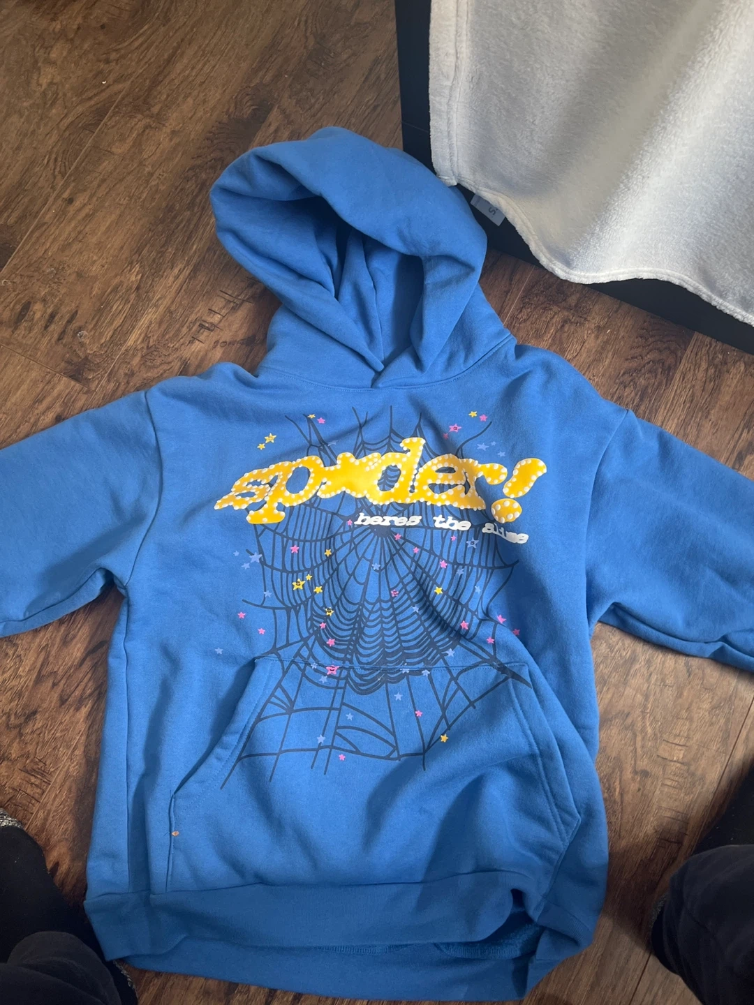 Selling a blue Sp5der hoodie. It features a spiderweb design on the front. The material looks soft and comfy, perfect for staying warm!