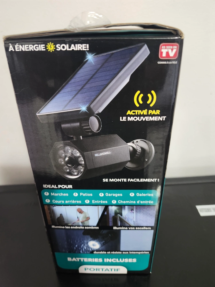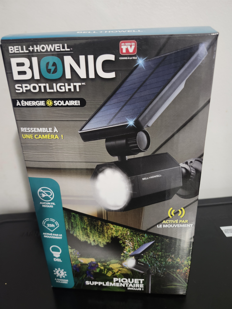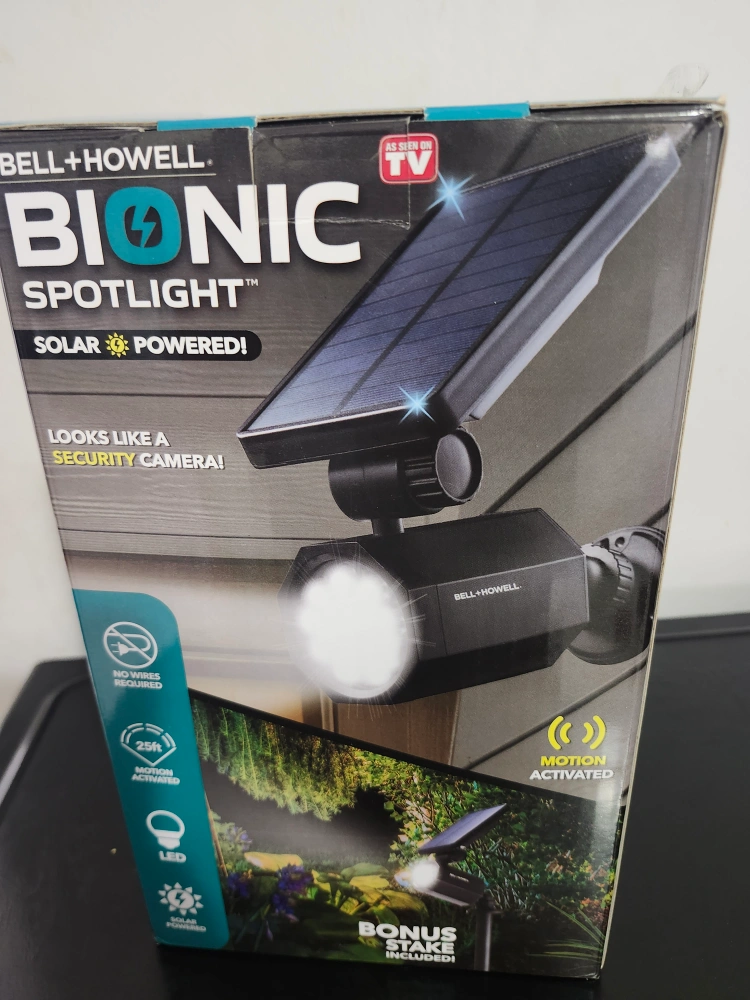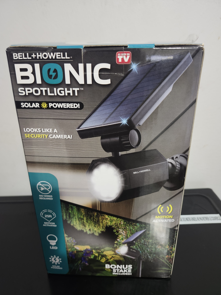 Selling a Bell+Howell Bionic solar power Spotlight. It's solar powered and motion activated. It looks like a security camera and includes a bonus stake. so it's ready to go!