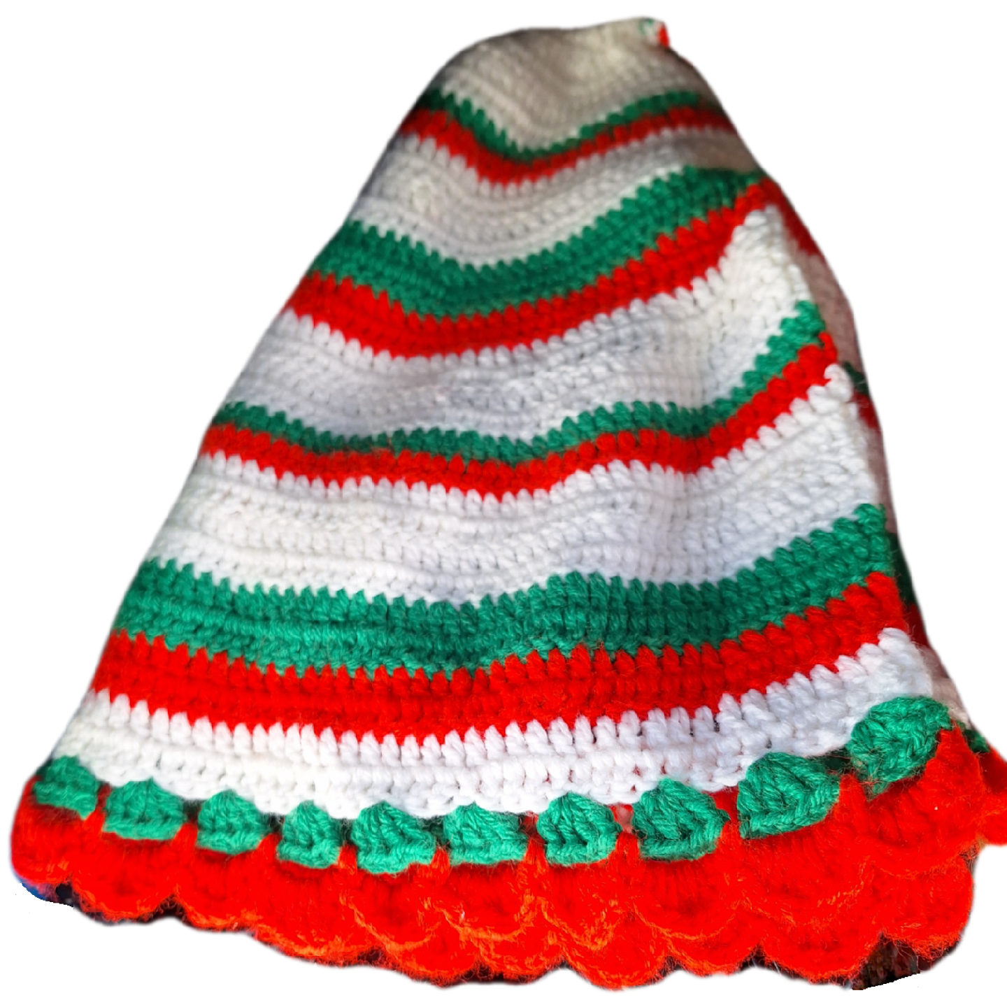 Vintage handmade crocheted Christmas tree skirt with red, white, and green stripes. Add a touch of vintage handmade charm to your holiday decor. Excellent condition.