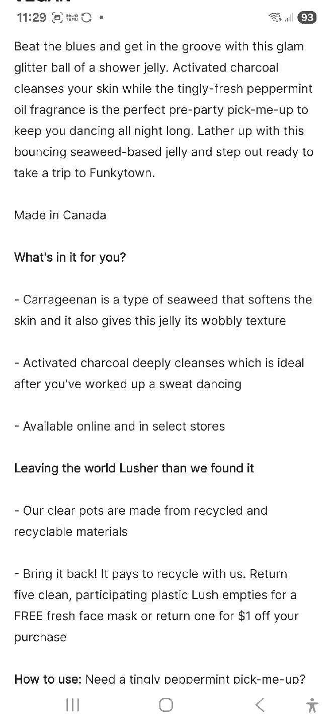 Get ready to groove with this glam glitter ball of a shower jelly! The activated charcoal cleanses your skin while the tingly-fresh peppermint oil fragrance is the perfect pre-party pick-me-up to keep you dancing all night long. Lather up with this bouncing seaweed-based jelly and step out ready to take a trip to Funky town. This jelly contains carrageenan, a type of seaweed that softens the skin and gives it its wobbly texture. Originally bought for $10.50