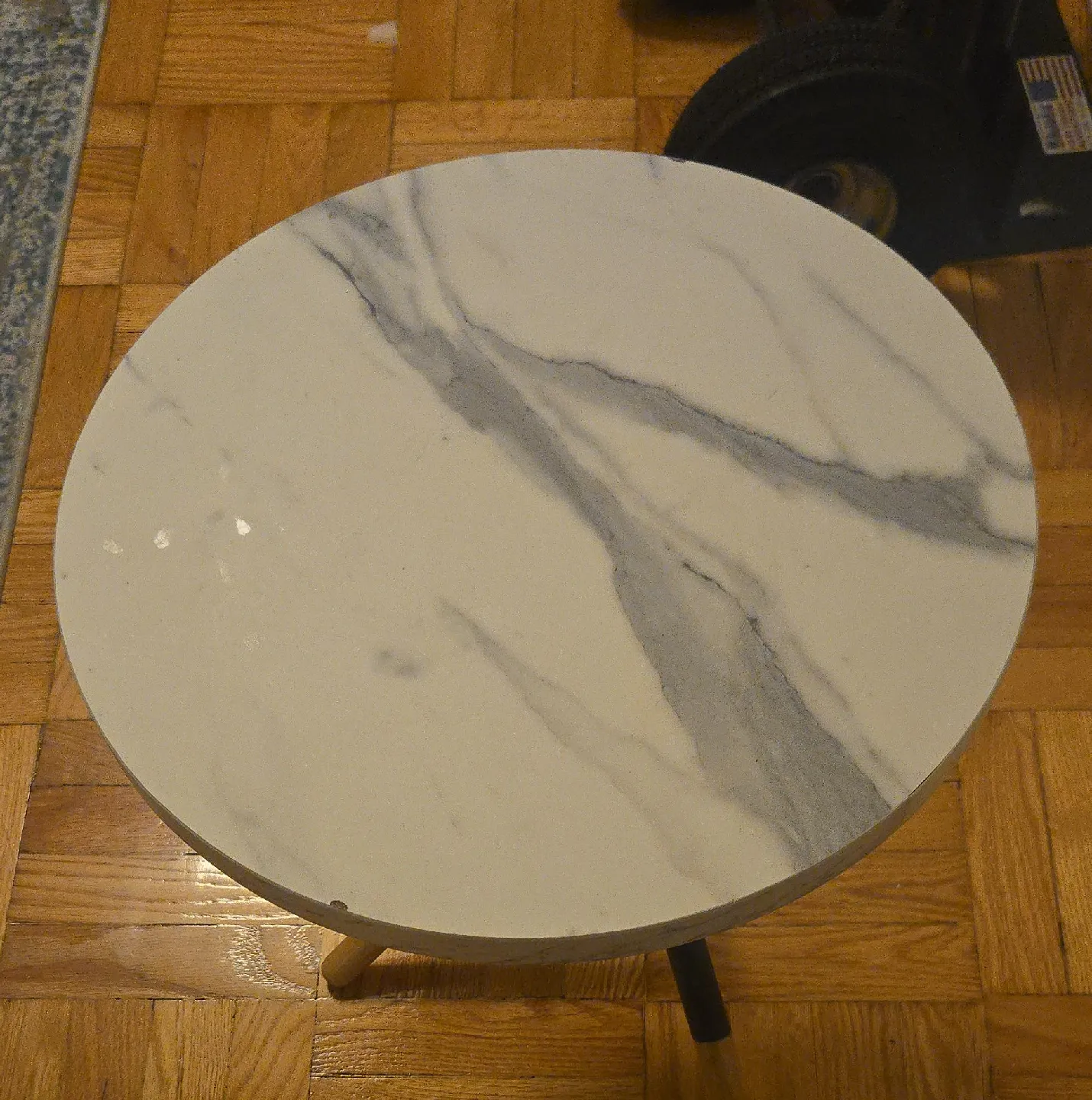 Selling a round side table with a faux marble top. It has a simple, modern design that would look great in any living room or bedroom. The table is in good condition and ready for a new home