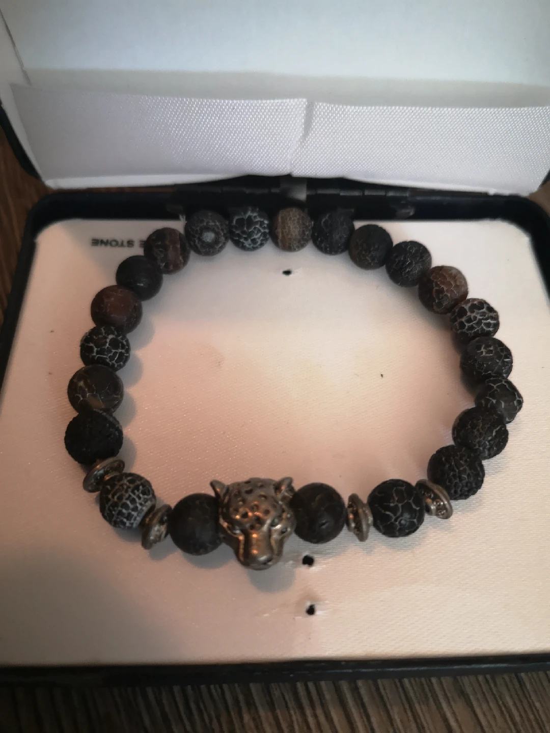 Selling a beaded bracelet with a cool jaguar head charm! It comes in its original box. The beads are a mix of black and grey, giving it a unique look. Perfect for adding a bit of edge to your style!