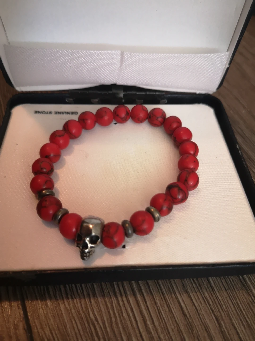 Here's a cool red beaded bracelet with a skull charm. It comes in a box, perfect for gifting or keeping it safe when you're not wearing it. The beads are a vibrant red colour, making it a standout piece!