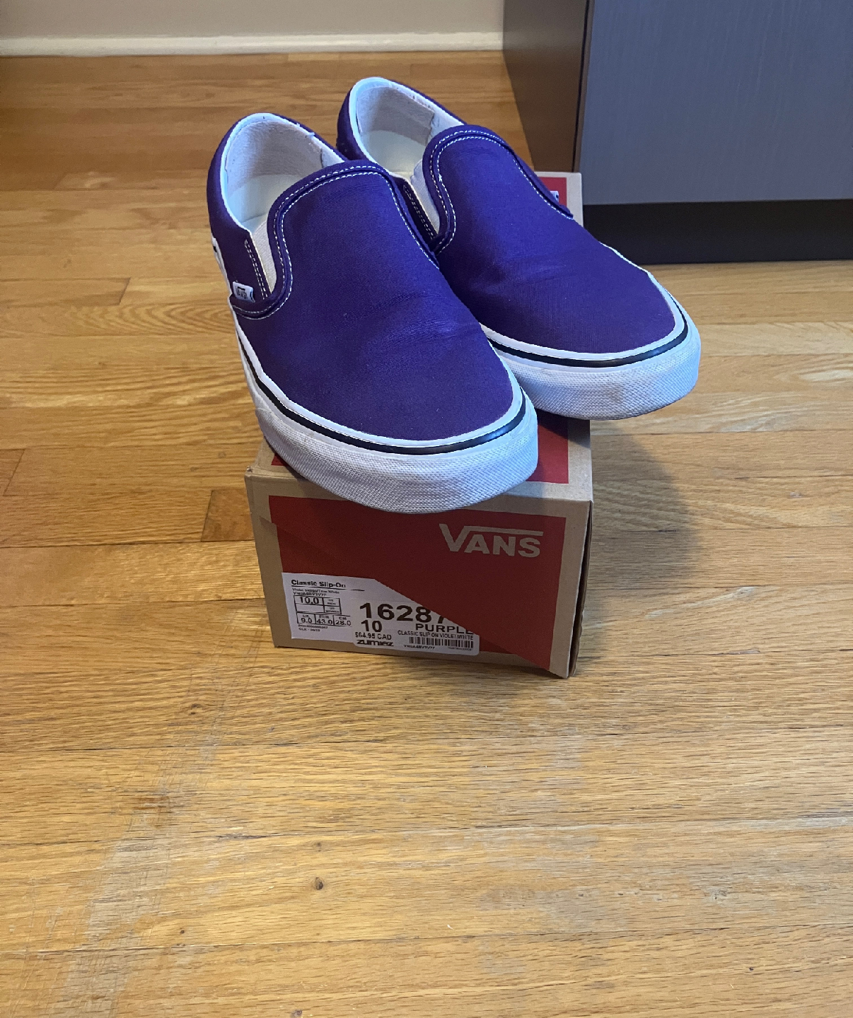 Selling a pair of Vans Classic Slip-On shoes in purple! They are size 10 and come with the original box