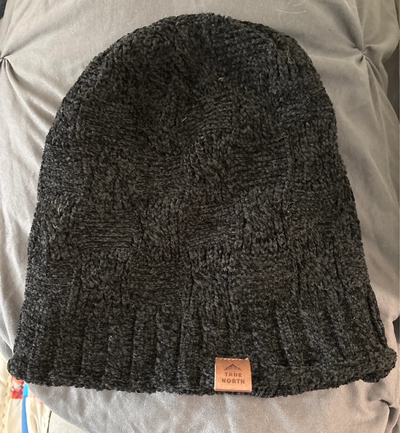 Cozy True North beanie, perfect for keeping warm on chilly days! It's a soft, knit material in a versatile black colour. The condition is great, ready for a new owner to enjoy