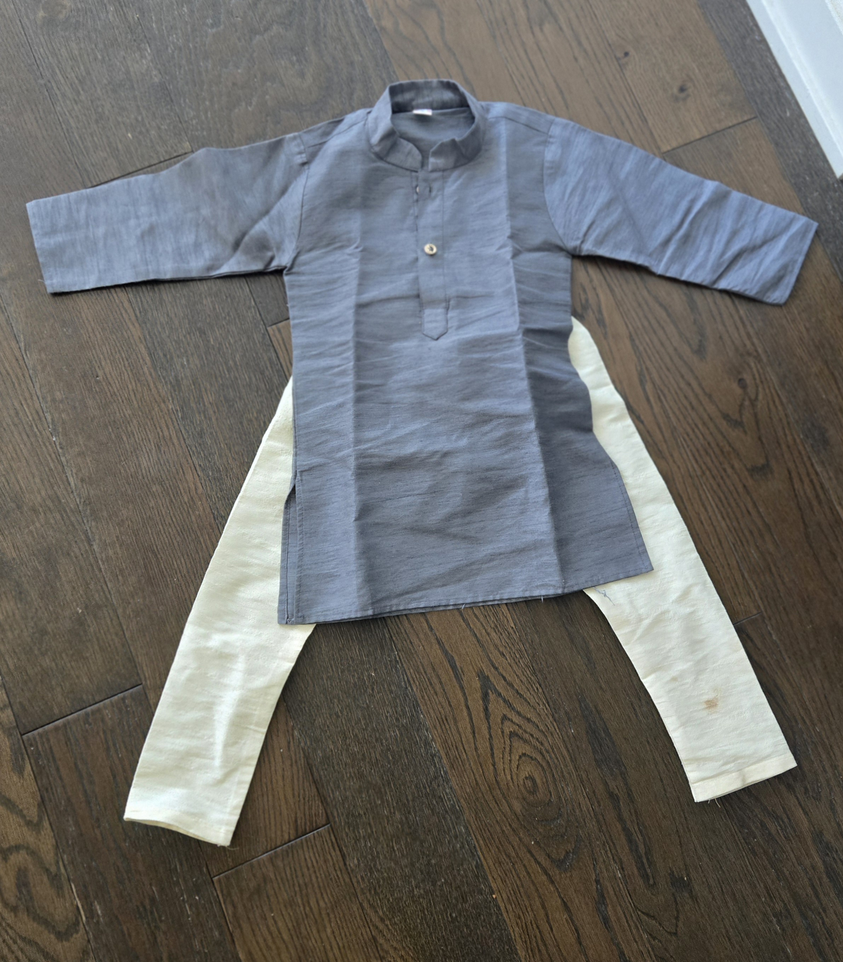 A cute kurta pajama set for kids! The kurta is a stylish grey colour, and the pajama pants are a cream colour. There is a small stain on one of the pant legs, but otherwise it is in good condition