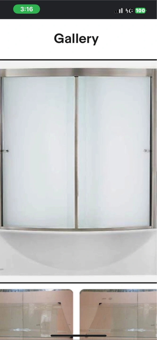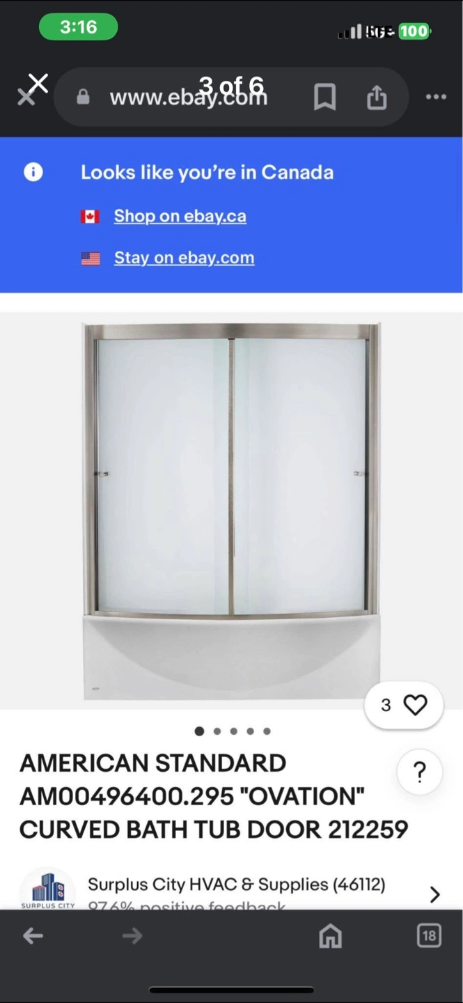 Selling an American Standard Ovation curved bath tub door. It's brand new and still in the box! The model number is AM00496400.295. It's a sliding tub door and the size is 57-59". The finish is satin