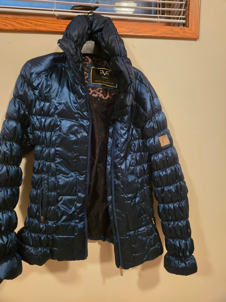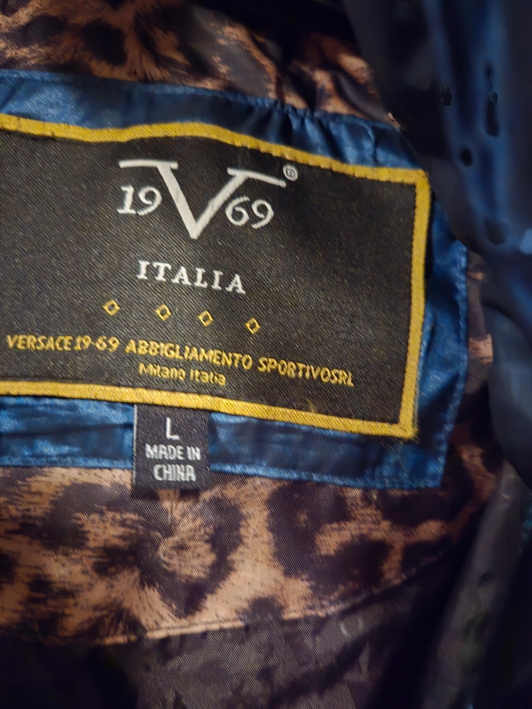 Stylish Versace 19.69 Italia padded jacket in size L. The shell is made of 55% polyester and 45% nylon, with a 100% polyester lining. The filling consists of 10% down and 90% polyester. Perfect for staying warm and fashionable!