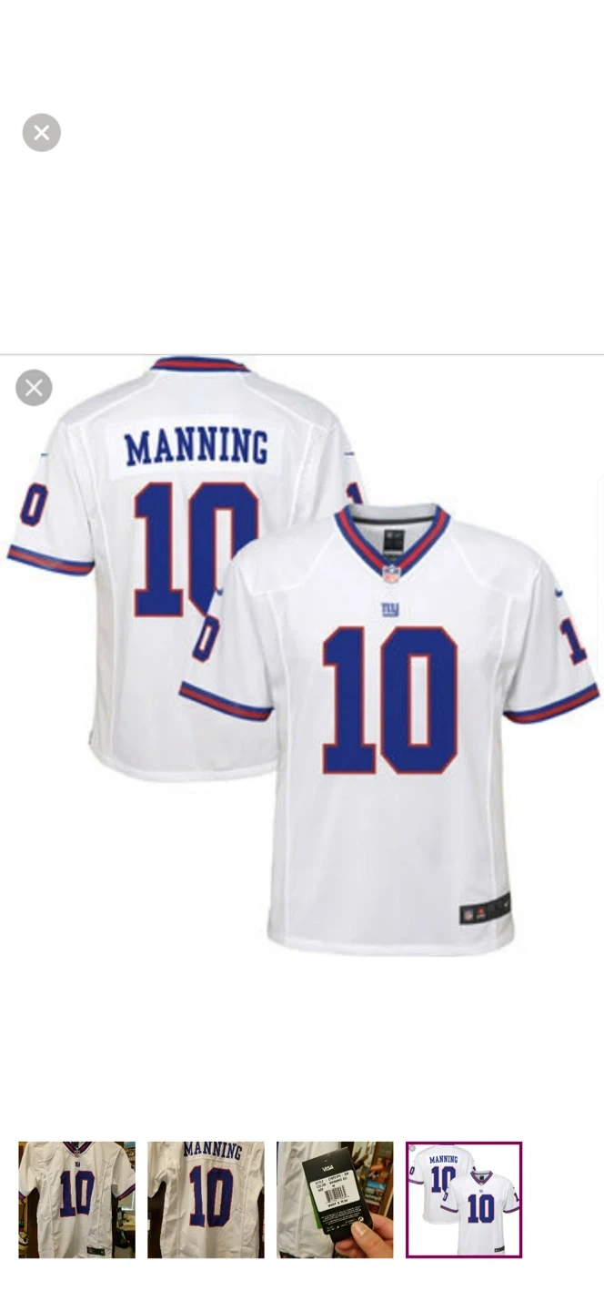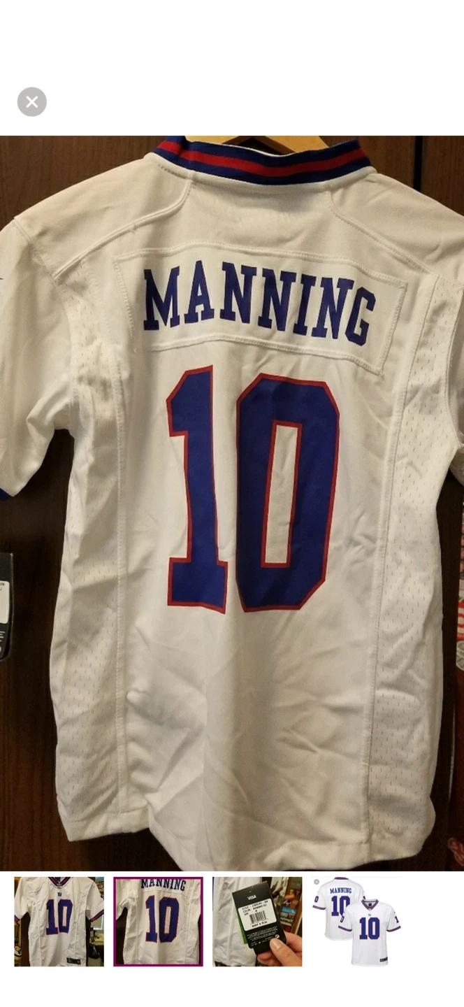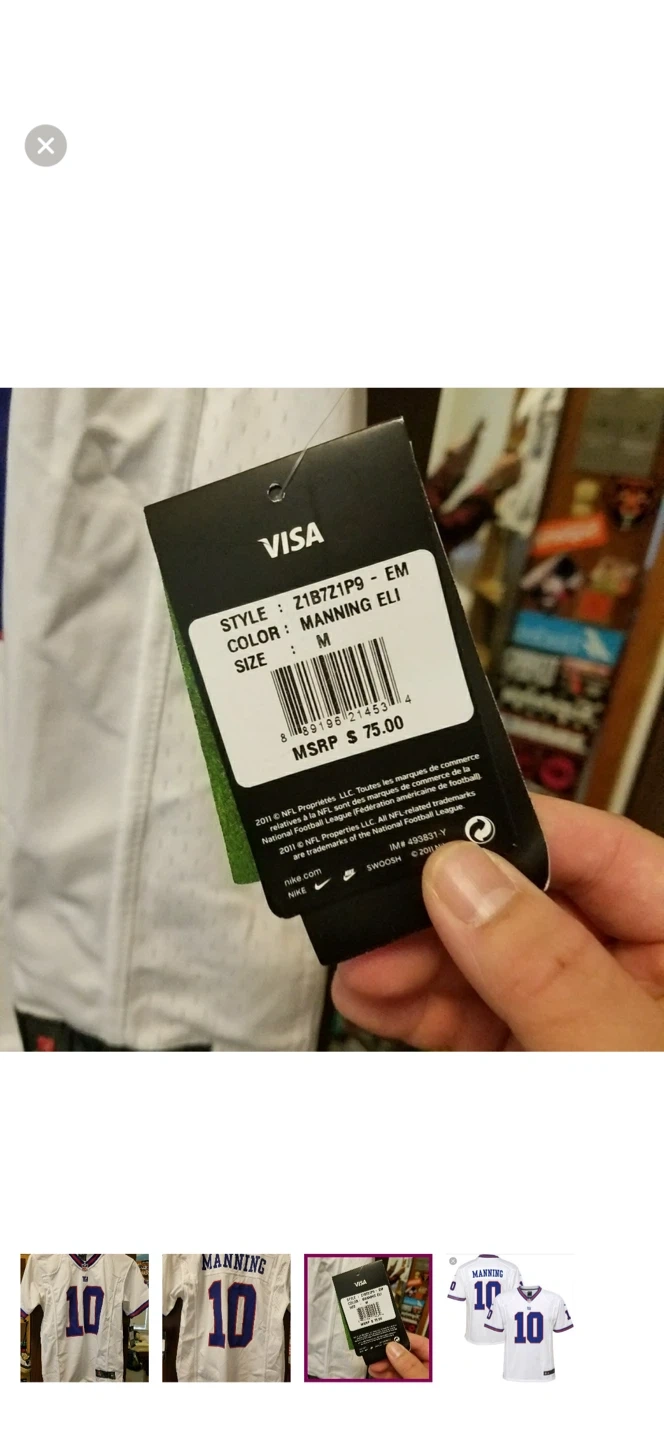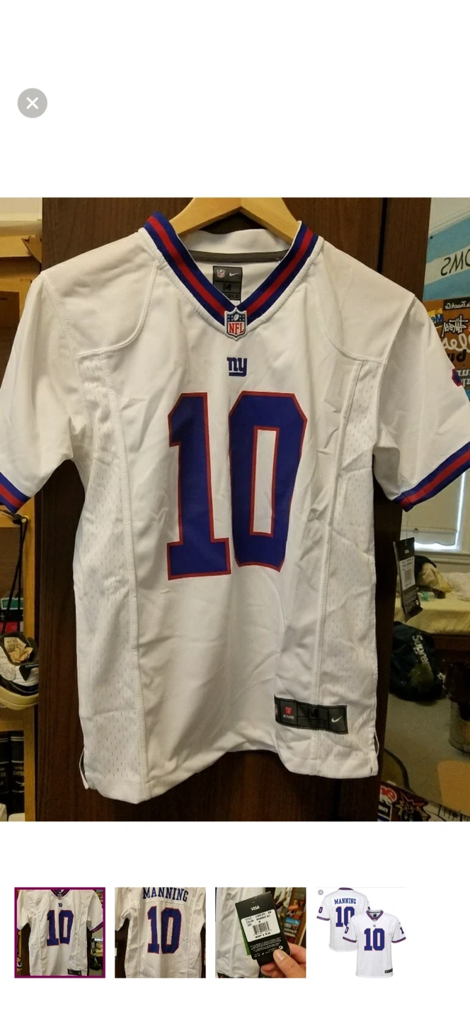 Selling a Nike Eli Manning #10 New York Giants jersey in size medium. It's white with blue and red accents. The style number on the tag is Z1B7Z1P9-EM. Originally retailed for $75
