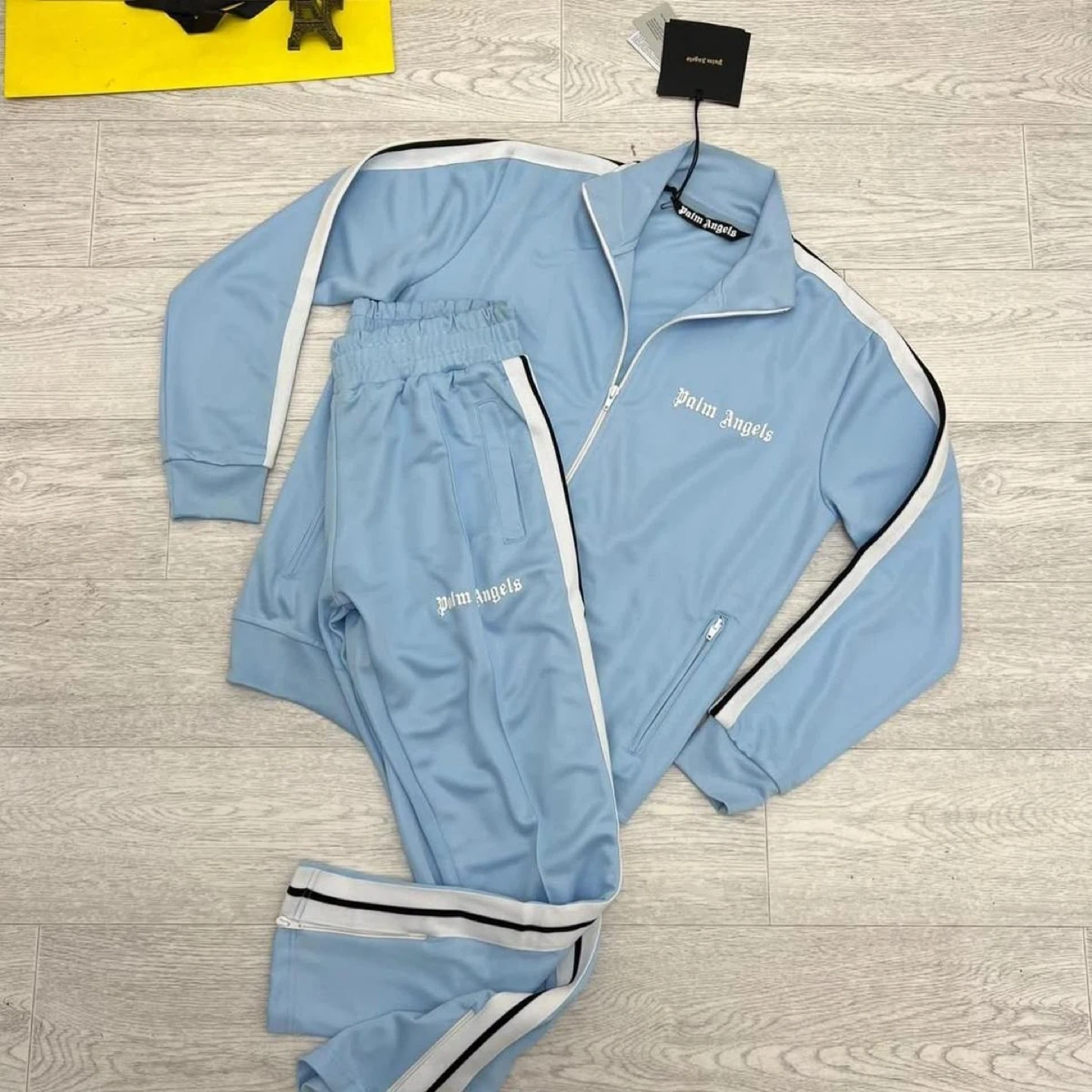 -715Selling a Palm Angels tracksuit in a lovely blue colour. It features the brand name on the jacket and pants, with white stripes along the sides. Perfect for a sporty and stylish look!