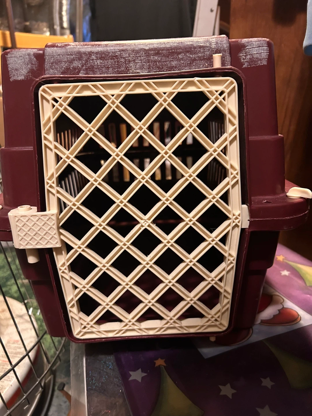 Pet carrier in good condition. Perfect for small dogs or cats. The carrier is a maroon colour with a cream coloured door. Cleaning mums basement, she has a few of these. Will clean before handing off to you.