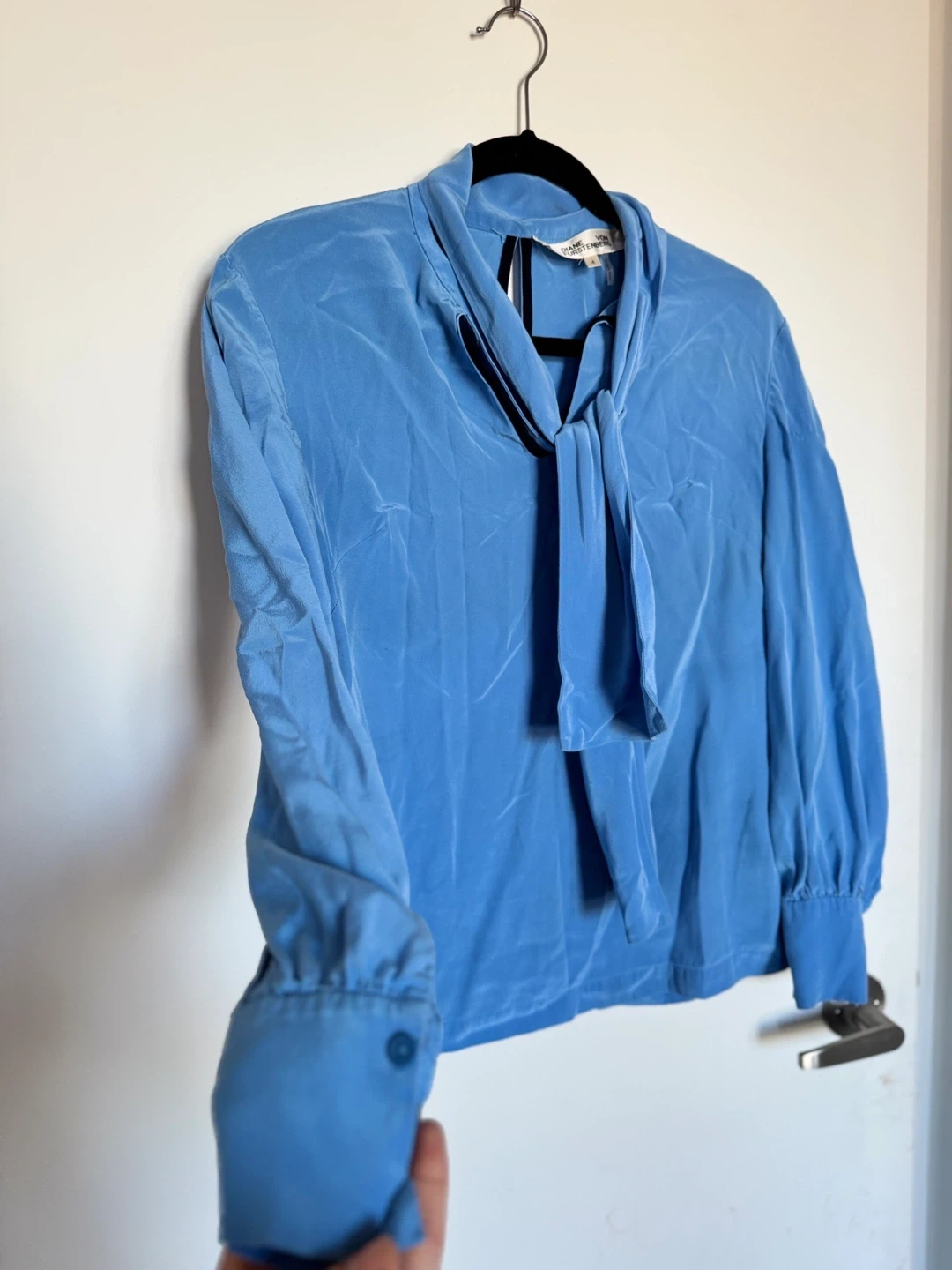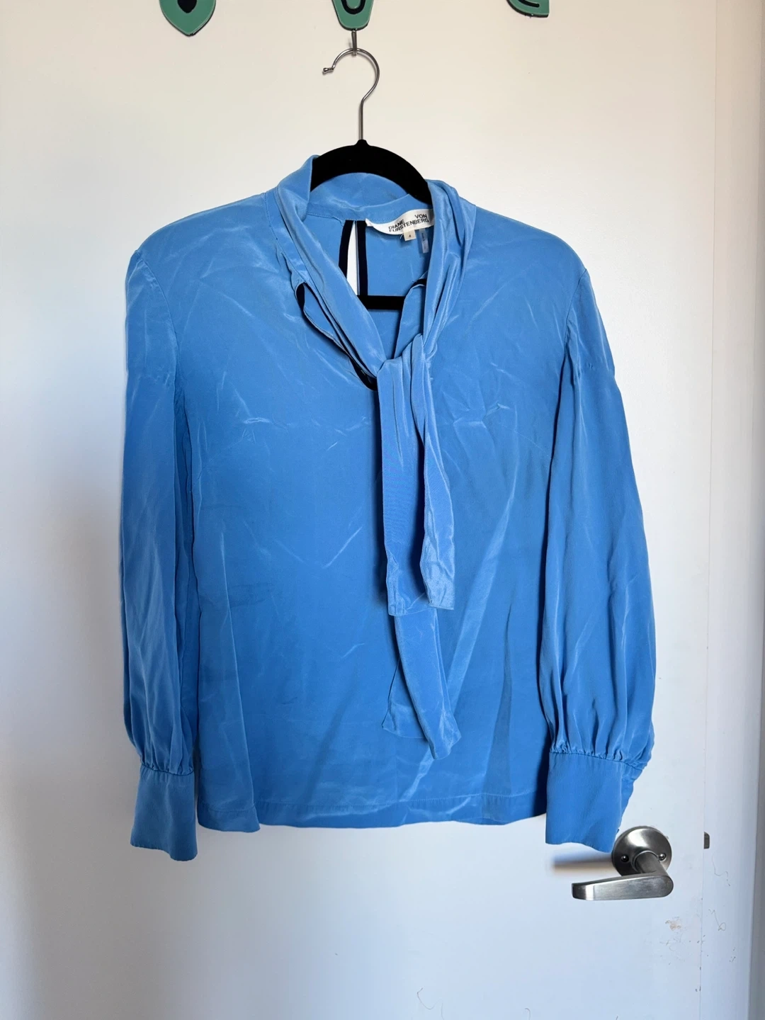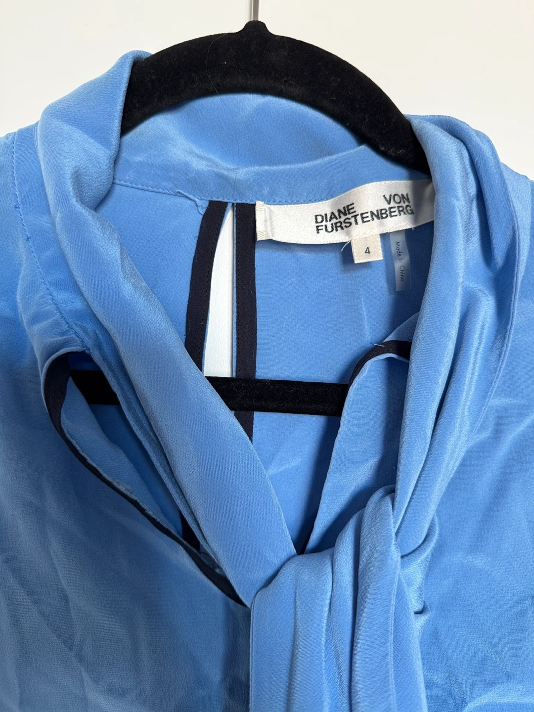 105Selling a lovely Diane von Furstenberg blouse in a beautiful shade of blue! It's a size 4 and in good condition.