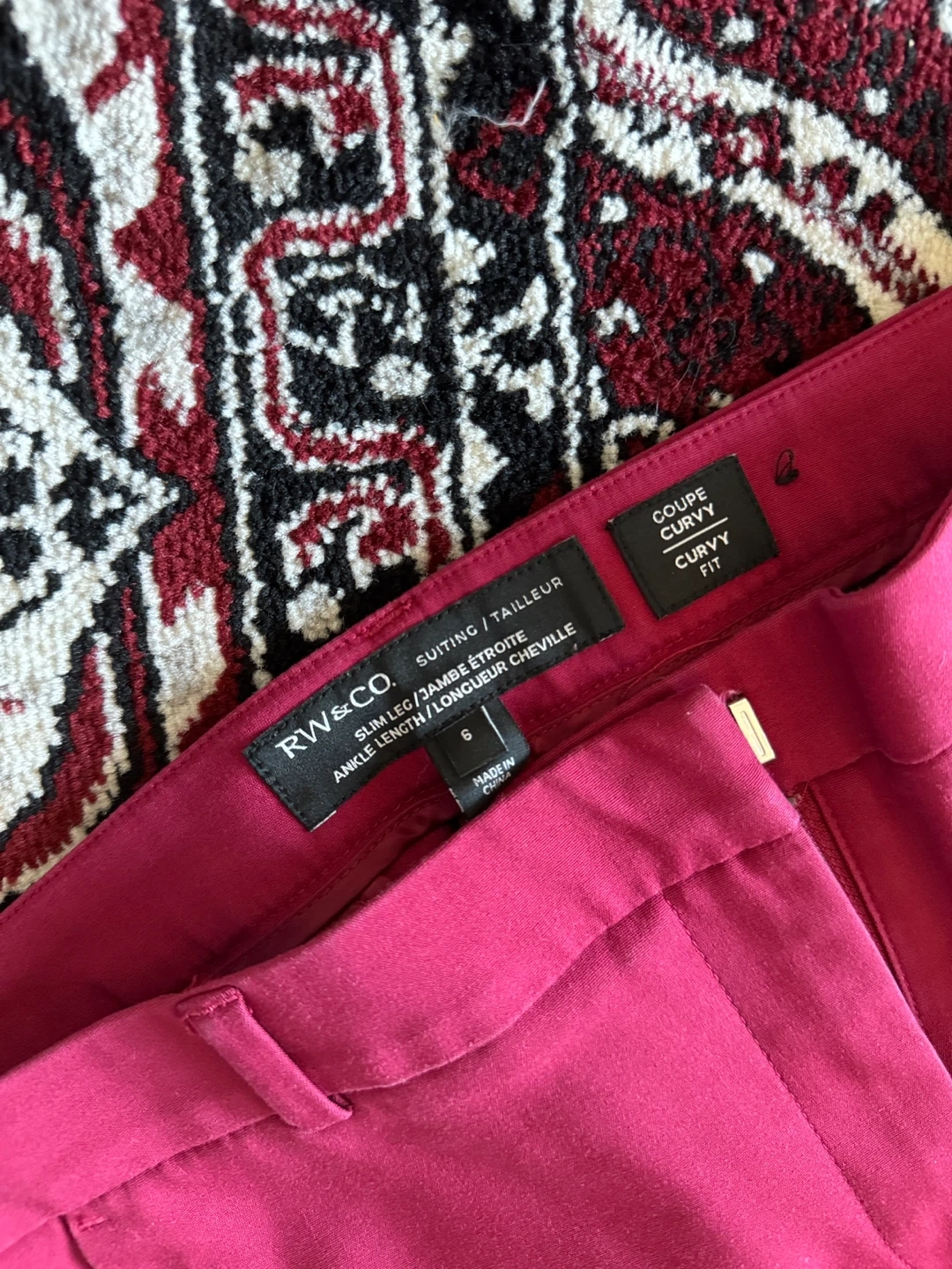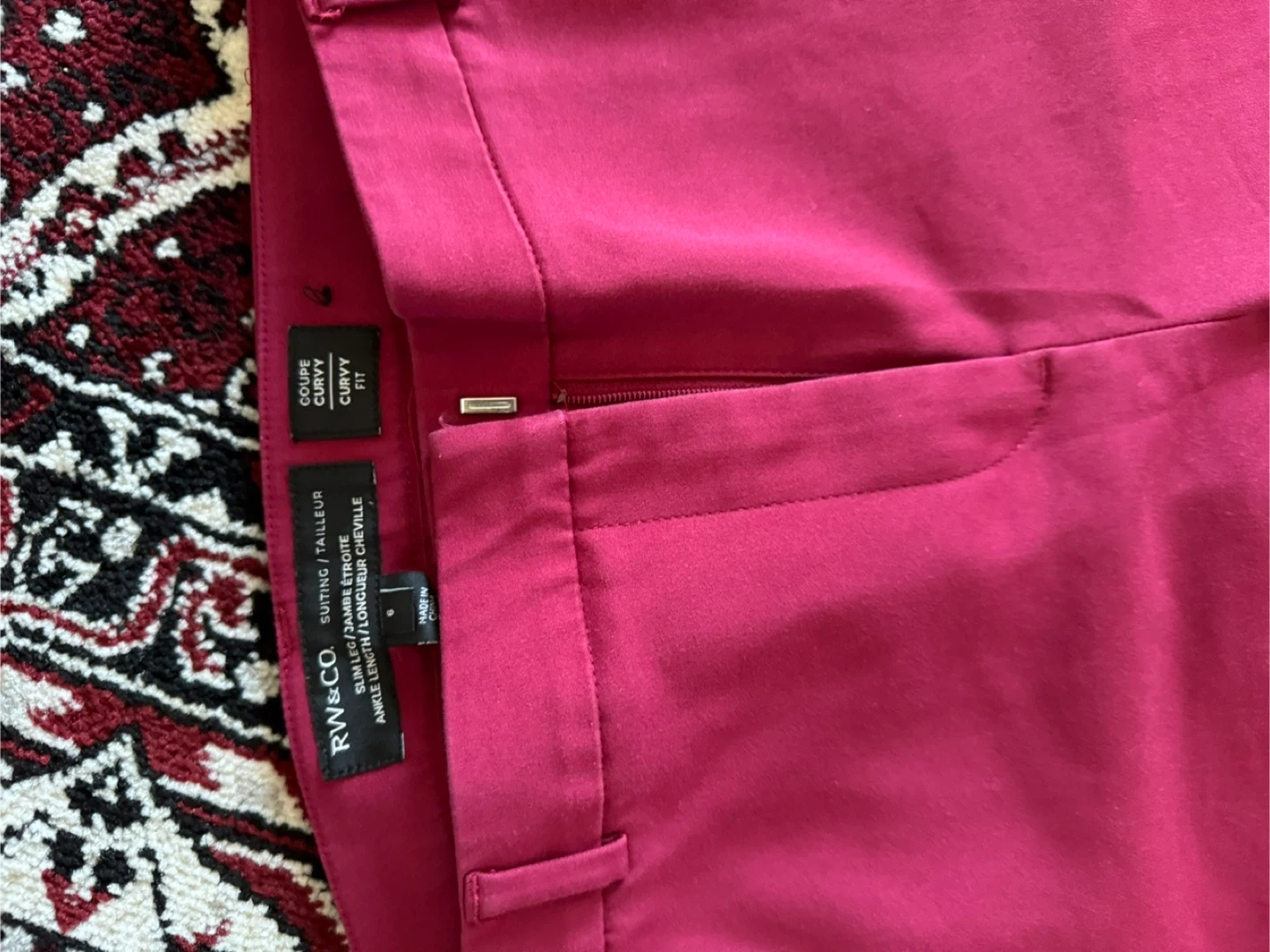 105RW&CO. Suiting/Tailleur pants in a lovely magenta colour! These are a size 6 and have a curvy fit. They are ankle length with a slim leg.