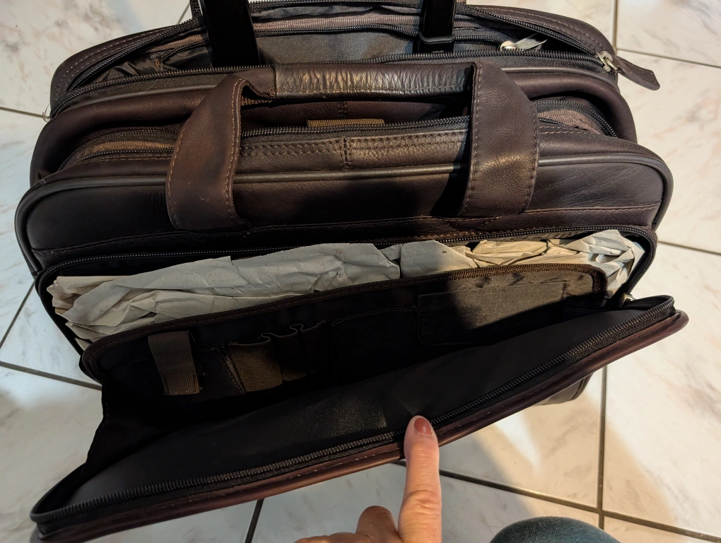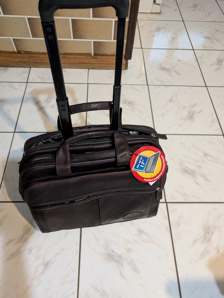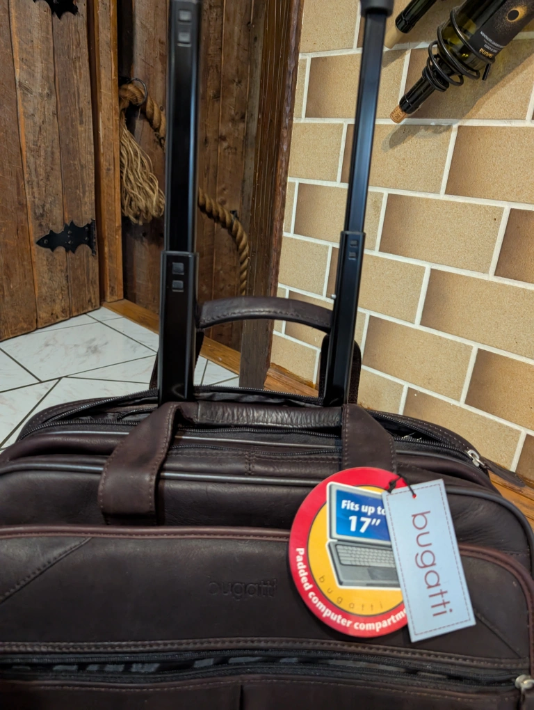 This Bugatti rolling laptop bag brand new condition! It's a rich brown leather and fits laptops up to 17". It features a padded computer compartment to keep your tech safe while you're on the go