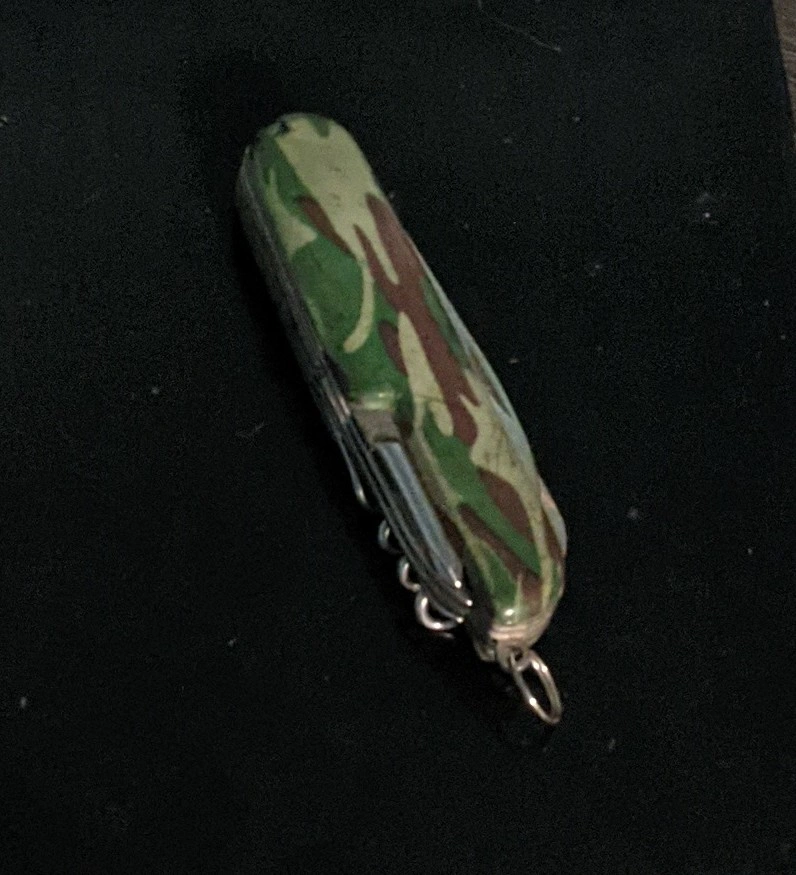 Selling a Swiss Army Knife with a camouflage pattern handle. It has multiple tools including a blade, corkscrew, and other useful attachments. Great for camping, hiking, or everyday use!