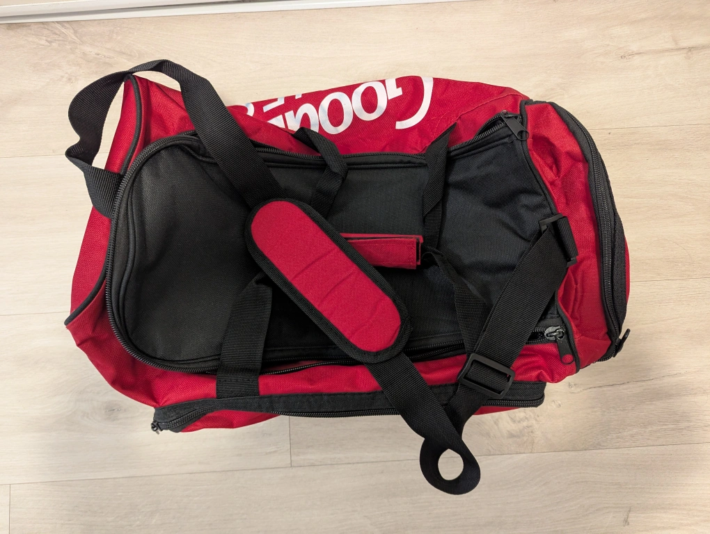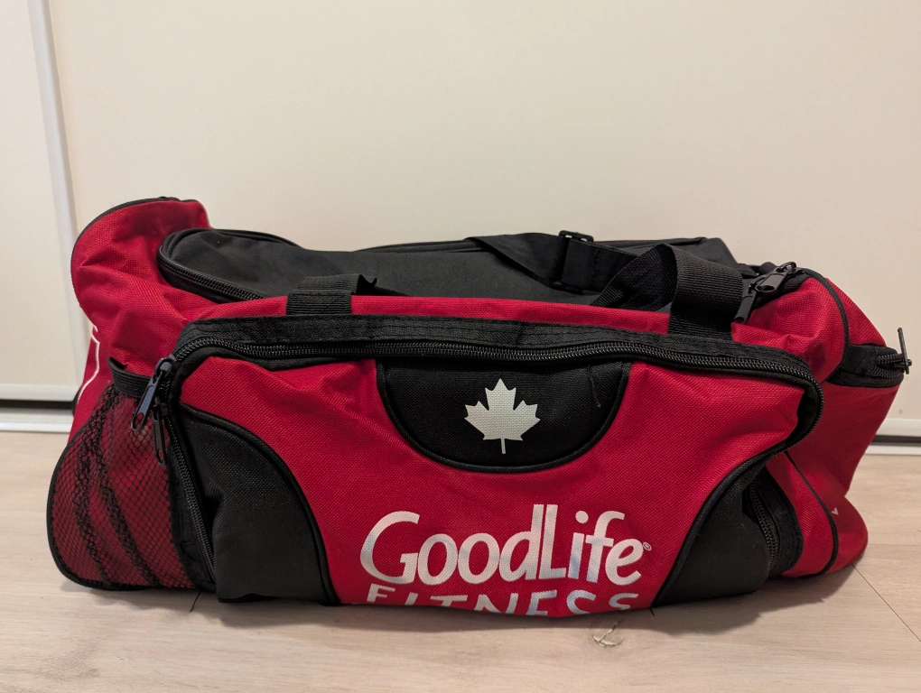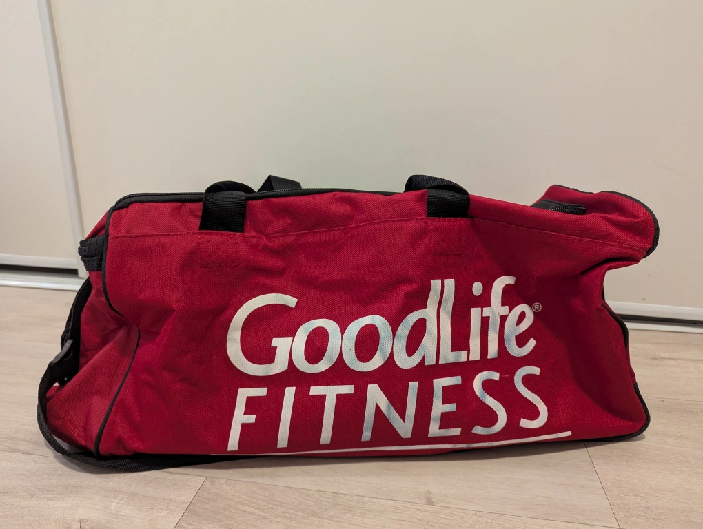 Donating GoodLife Fitness gym duffle bag in red and black. It's in great shape and ready for your workouts! Perfect for carrying all your gym essentials