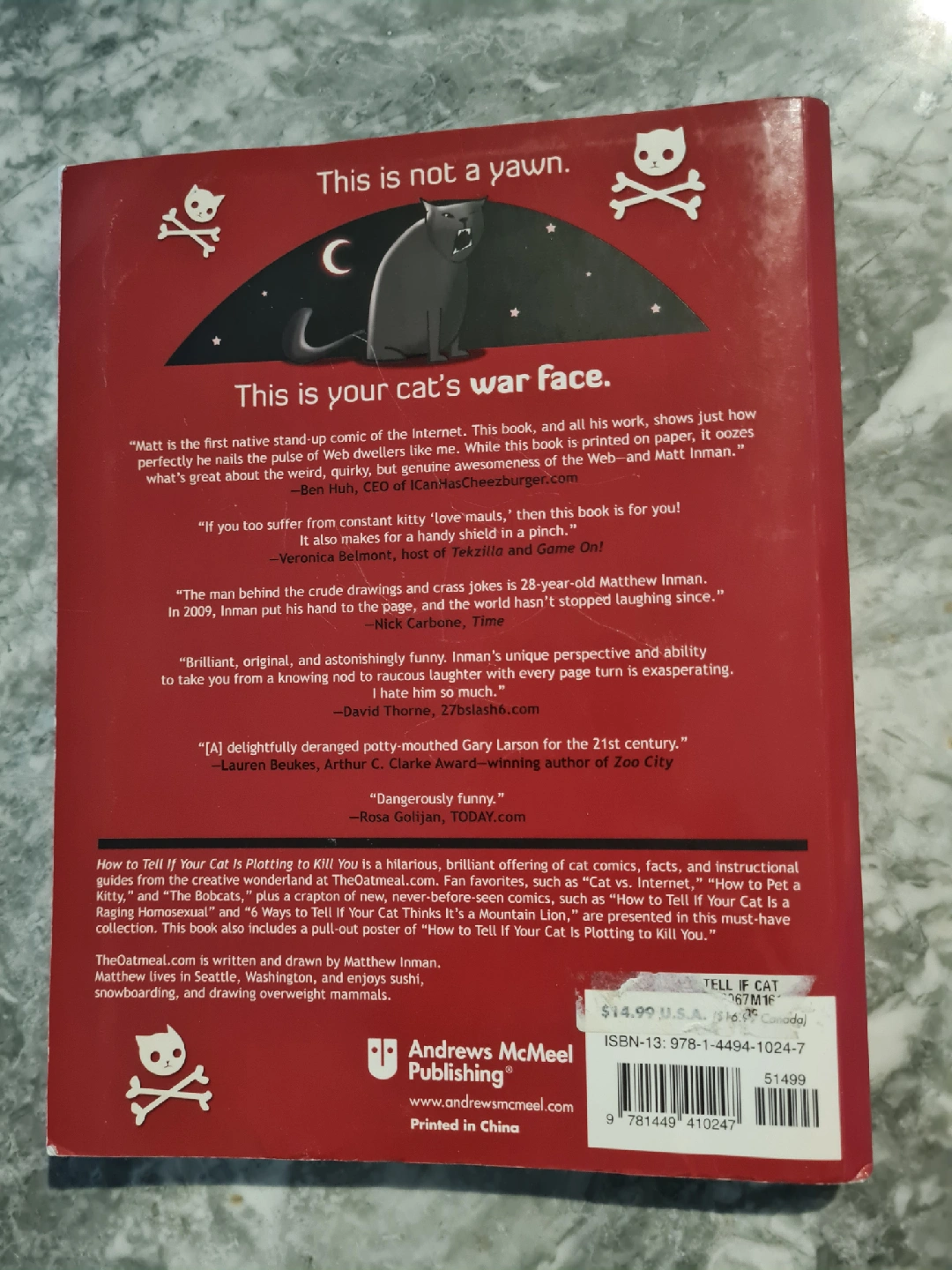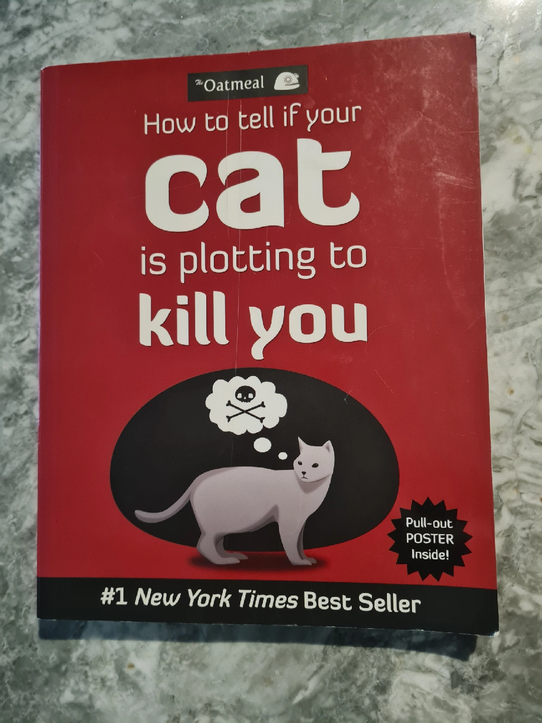 97Selling a copy of "How to Tell If Your Cat Is Plotting to Kill You" by The Oatmeal! It's a hilarious collection of cat comics, facts, and instructional guides from the creative mind of Matthew Inman. This book is a #1 New York Times Best Seller. Bonus poster not included.