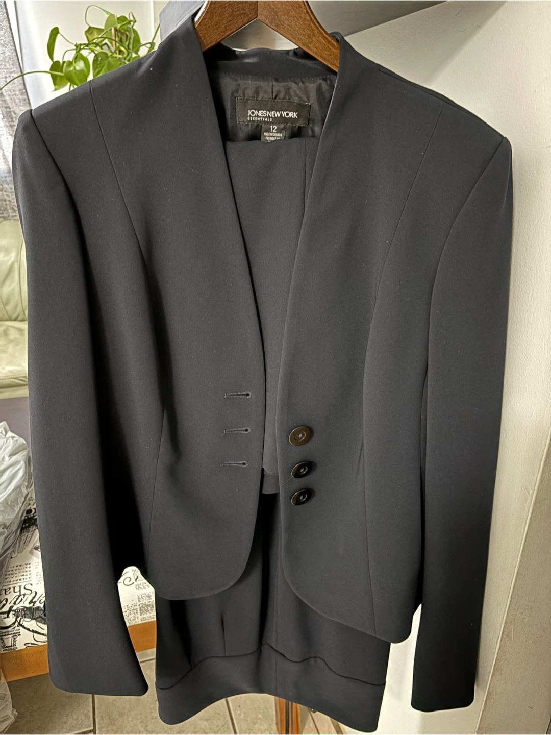 Selling a classic Jones New York black suit in size 12. It's in great condition and ready for a new home! Perfect for interviews or professional settings. The suit includes both the jacket and skirt.