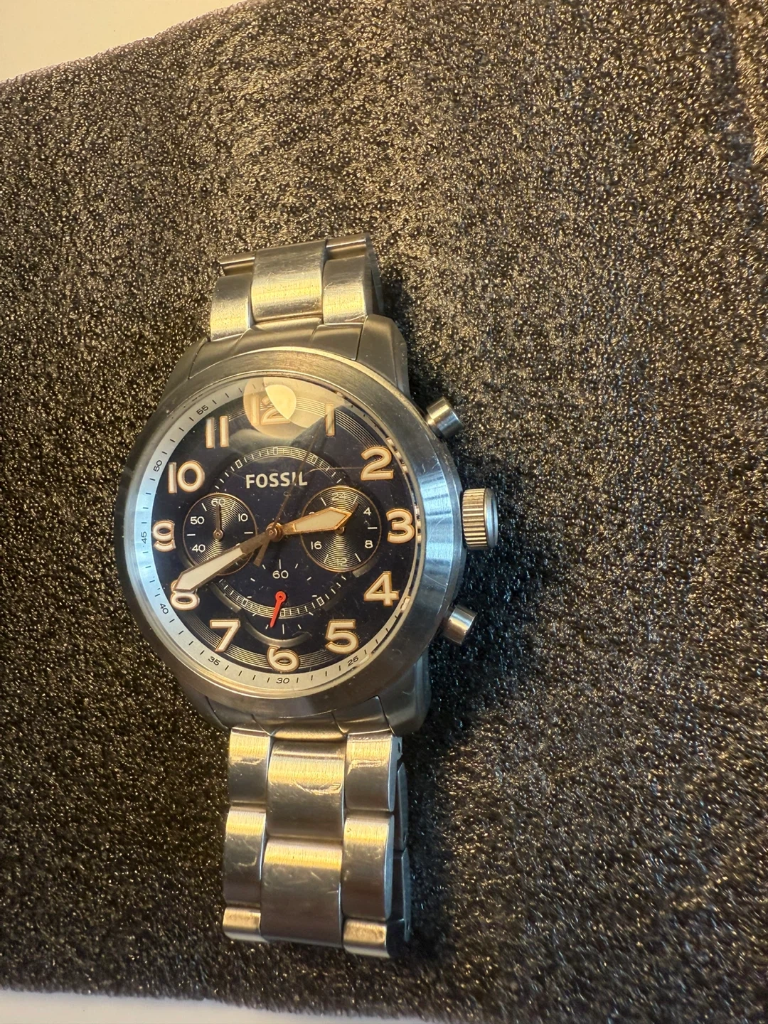 Selling a Fossil men's watch. It's in great condition and ready for a new owner! This stylish timepiece features a stainless steel band and a dark blue dial with chronograph functions