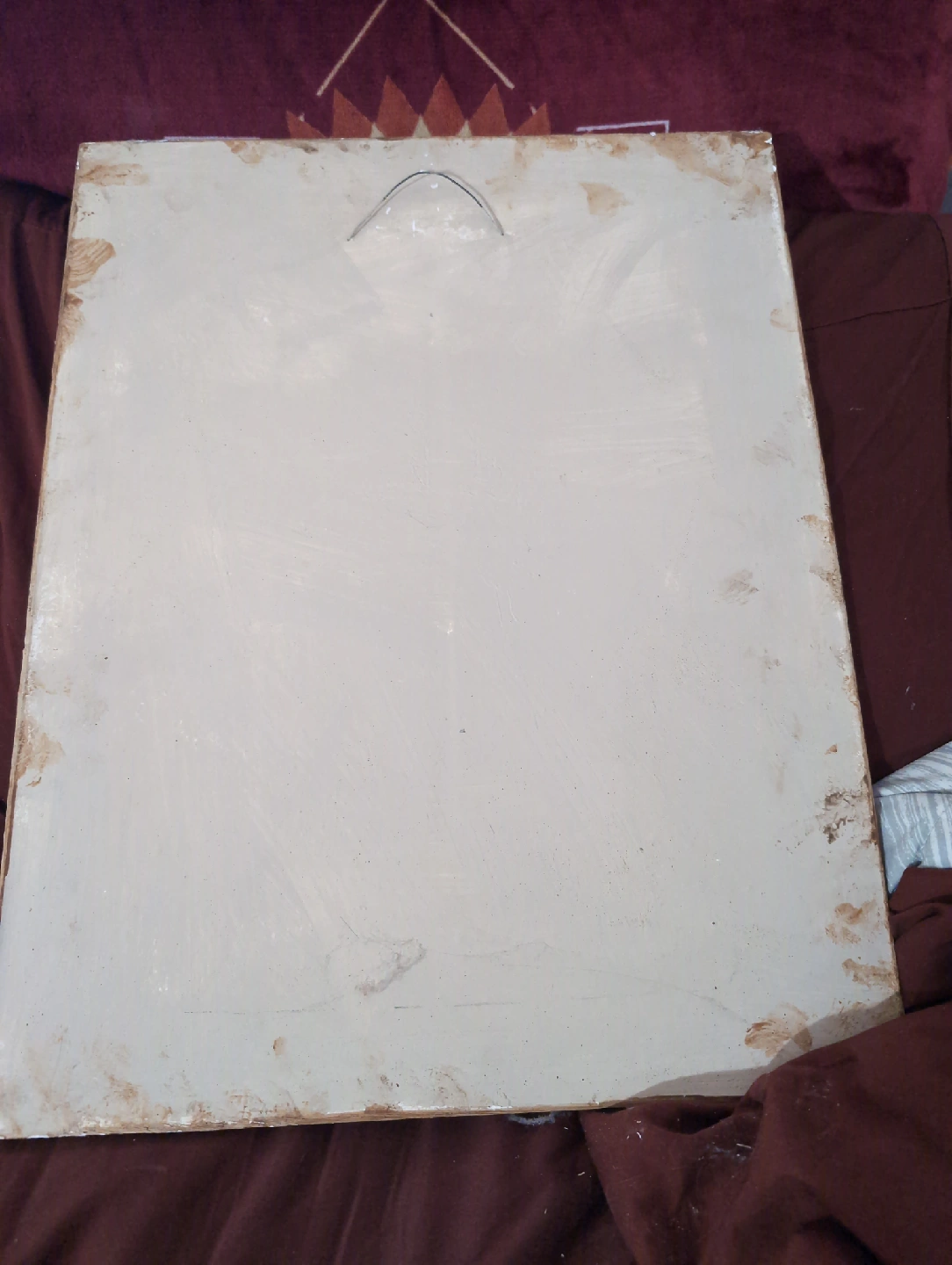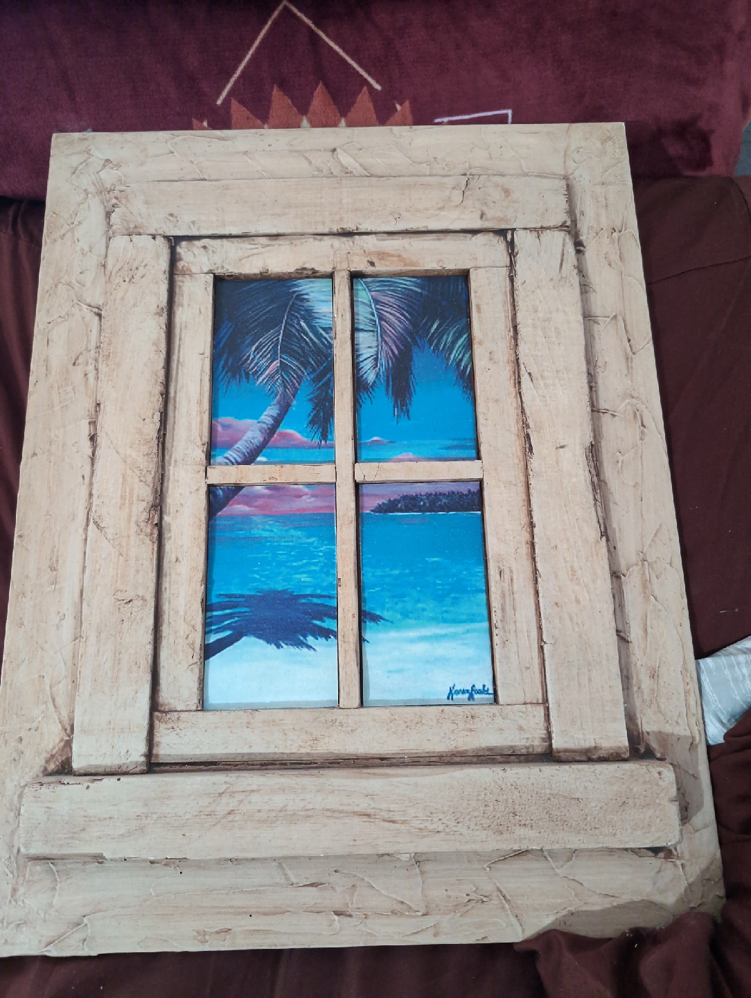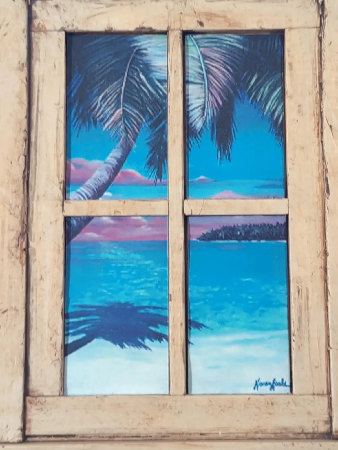 This beach scene window picture is made of Clay (backing), wood (window frame) and the actual painted tropical beach scene (tiles).
