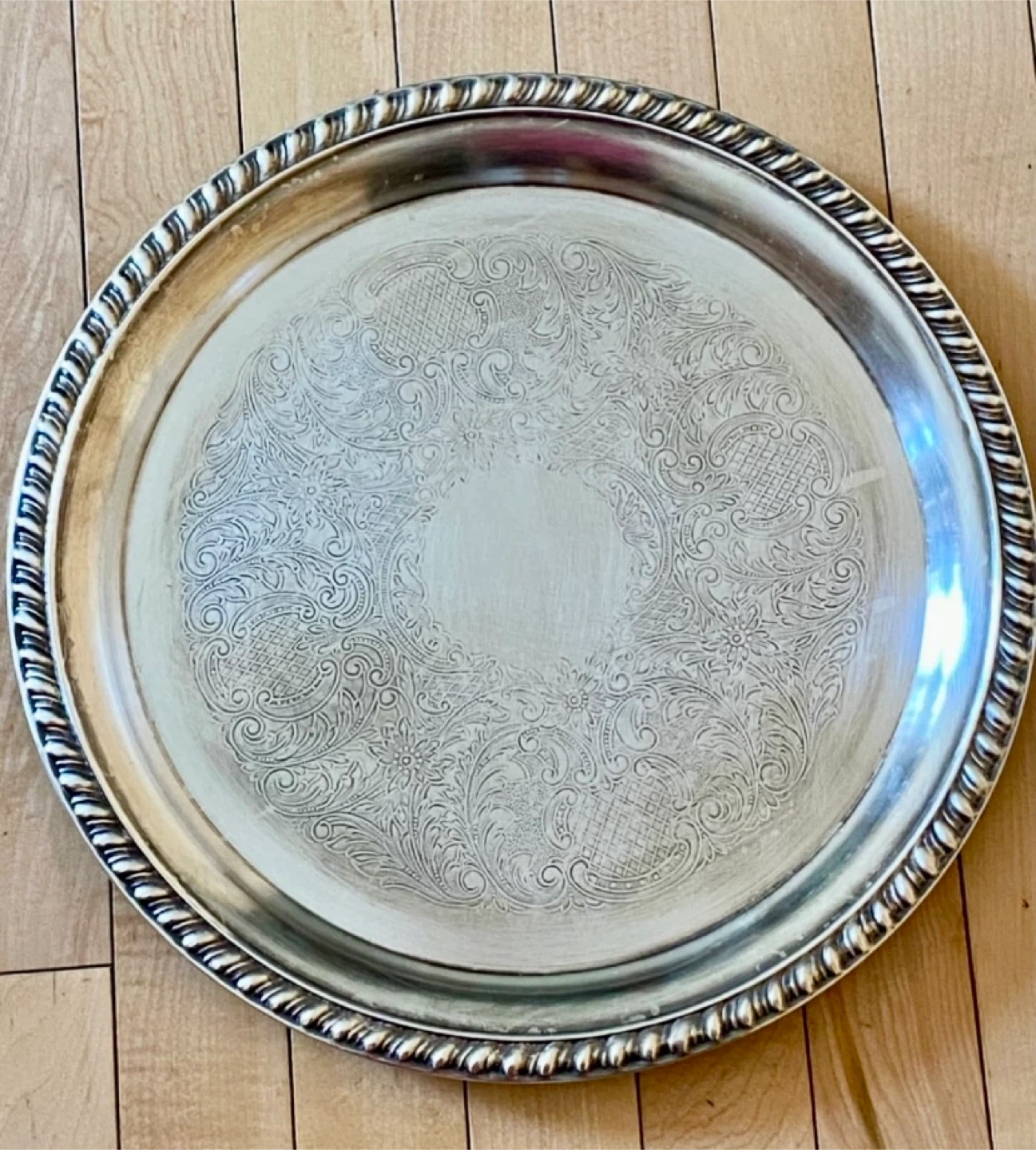 Selling a Leonard Silverplate round serving tray. It features a beautiful floral pattern and a decorative rope edge. Perfect for serving snacks or displaying decorative items!