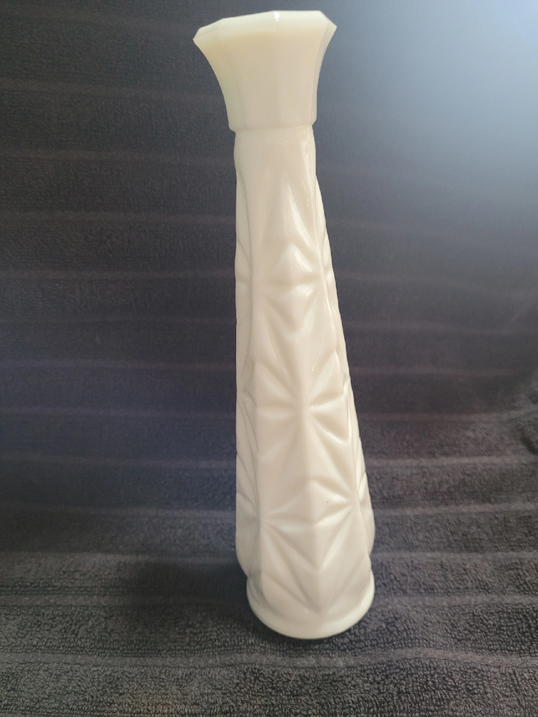 10Selling a lovely vintage milk glass vase. It's in great shape and would look beautiful with flowers or as a standalone piece on a shelf. Its unique design adds a touch of retro charm to any room