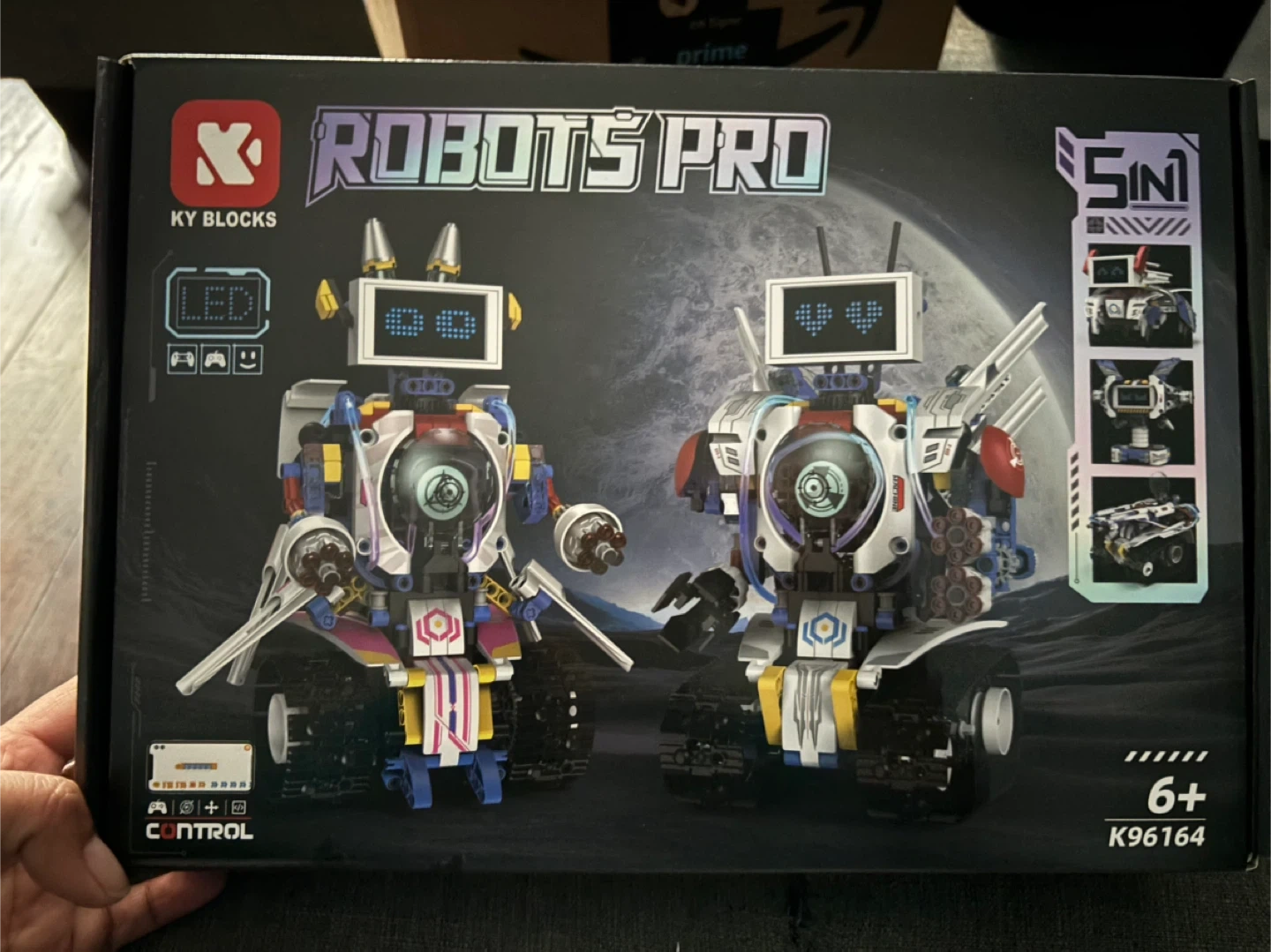 This is a Robots Pro 5 in 1 KY Blocks robot building kit! It's suitable for ages 6+. The box shows that it can be assembled into 5 different robots: Night Shadow Nala, Wisdom Ah Q, Thickening Cannon, Battle Dog, and Super Warriors! Great for STEM education