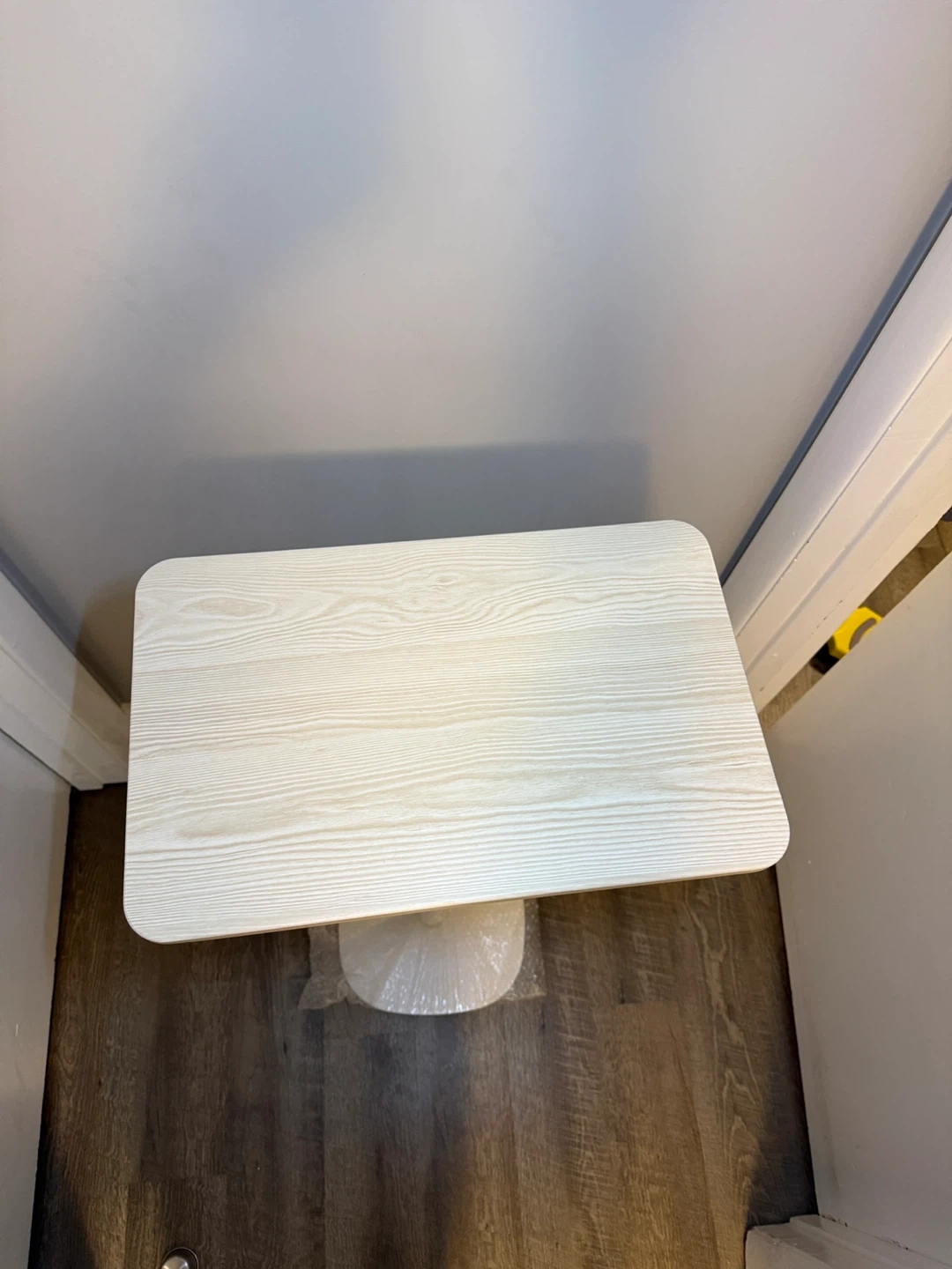 Selling a brand new adjustable height laptop stand. It's in perfect condition and ready to go! The stand features a light wood-look top and a white base. Great for working from home or using as a side table!