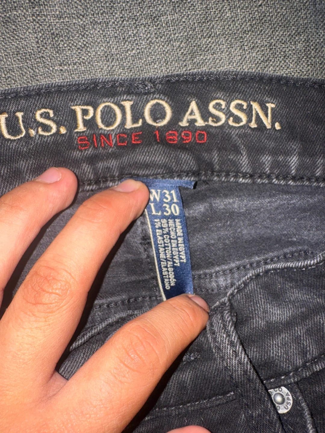 Selling a pair of U.S. Polo Assn. black jeans in size W31 L30. They are made of 99% cotton and 1% elastane. The jeans are in great condition and ready for a new home!
