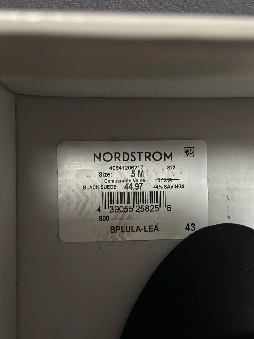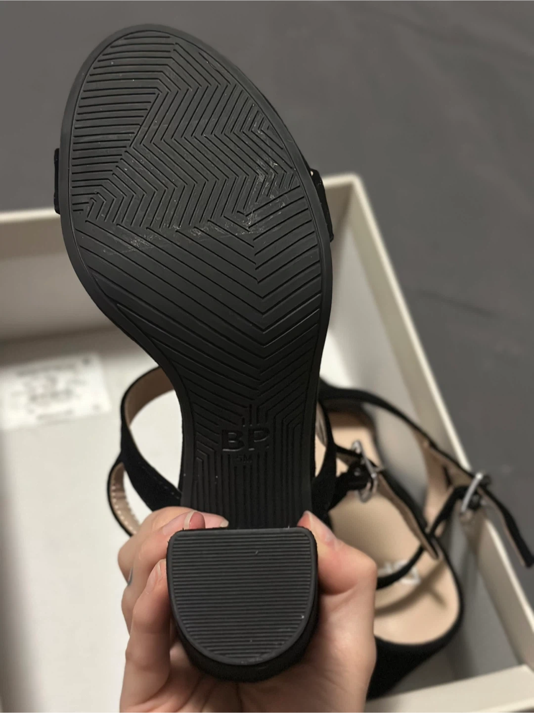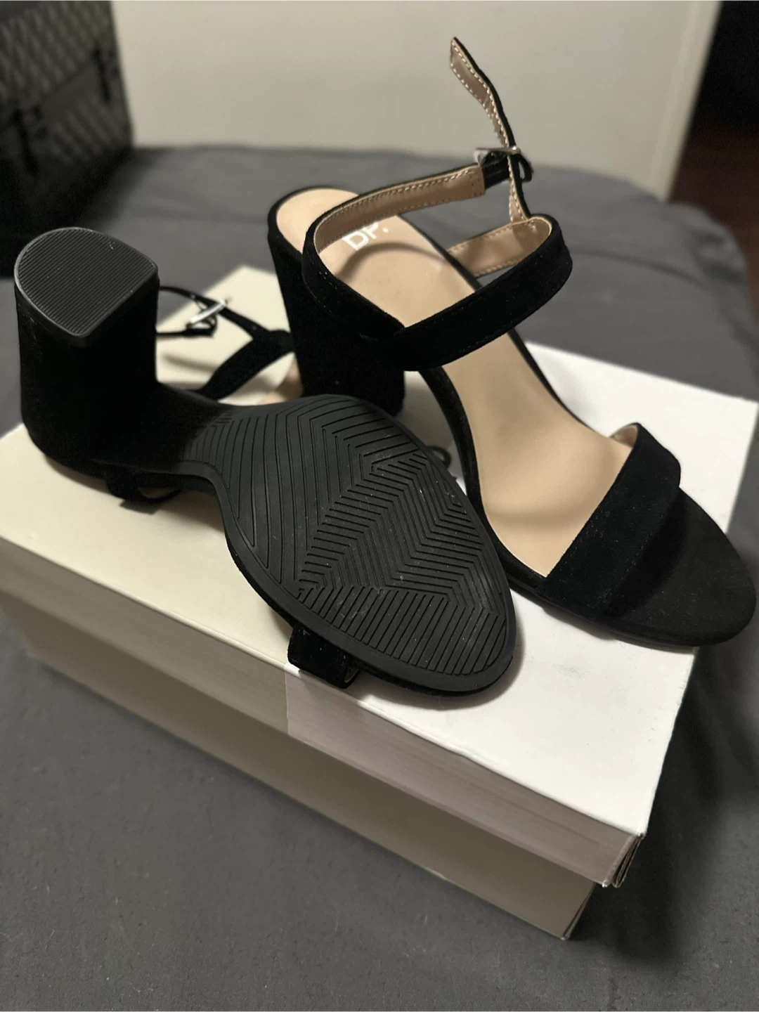 566Selling a pair of BP black suede heels in size 5. They are in new condition and come with the original box. The tag shows a comparable value of $79.95 - paid $44,97
