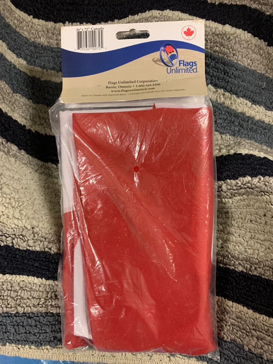 Selling a brand new Canadian flag, still in its original packaging! It measures 36" x 72" (90cm x 180cm). The packaging states that the fabric resists fraying, making it ideal for daily outdoor flying
