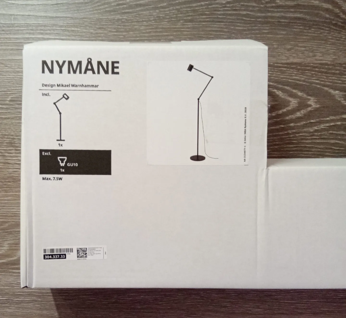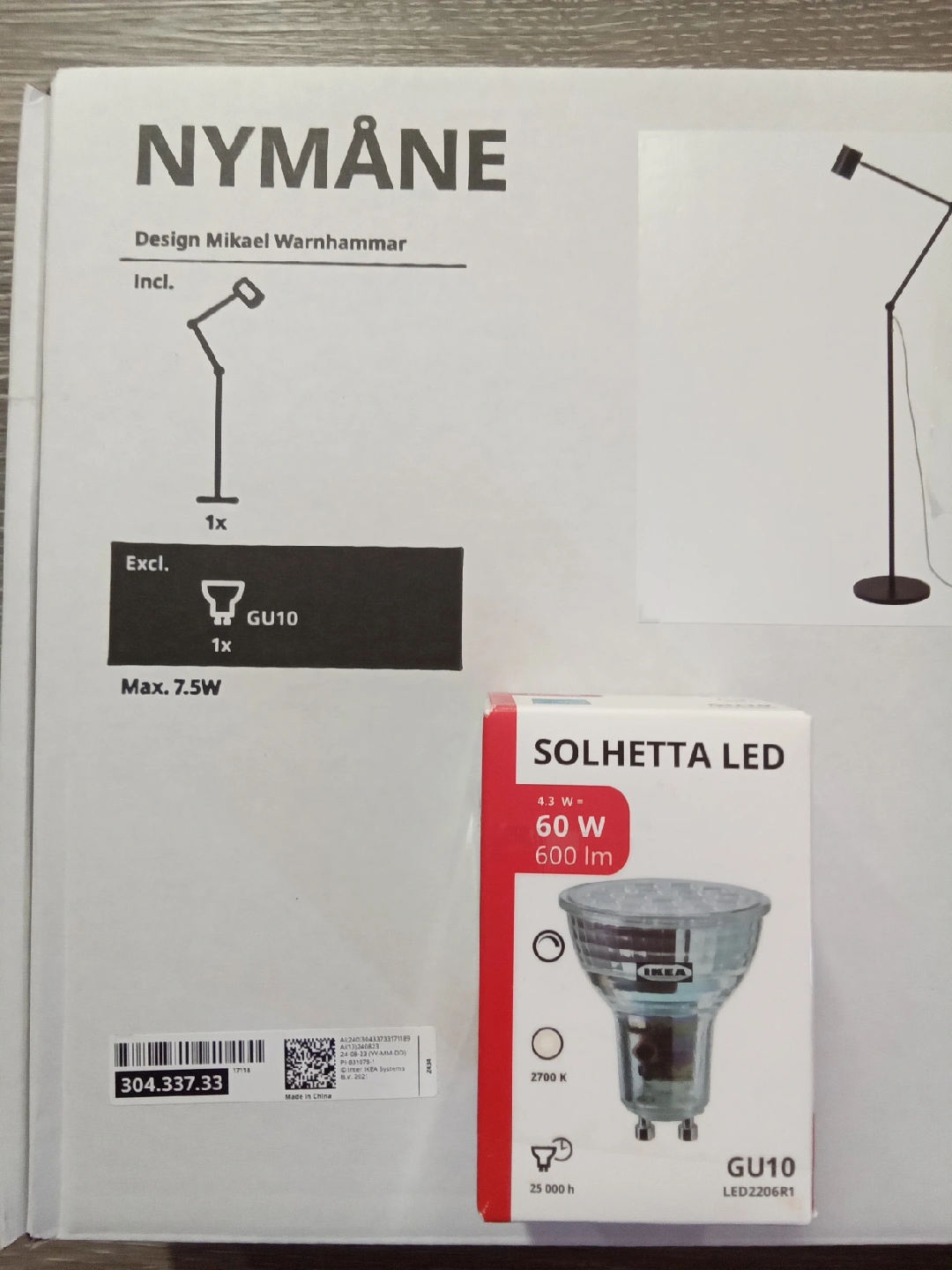 Brand new NYMANE floor lamp from IKEA original packaging. We have never used it. The box includes the lamp components, instructions, and a SOLHETTA LED bulb (GU10, 4.3W, 600 lm). Max 7.5W.