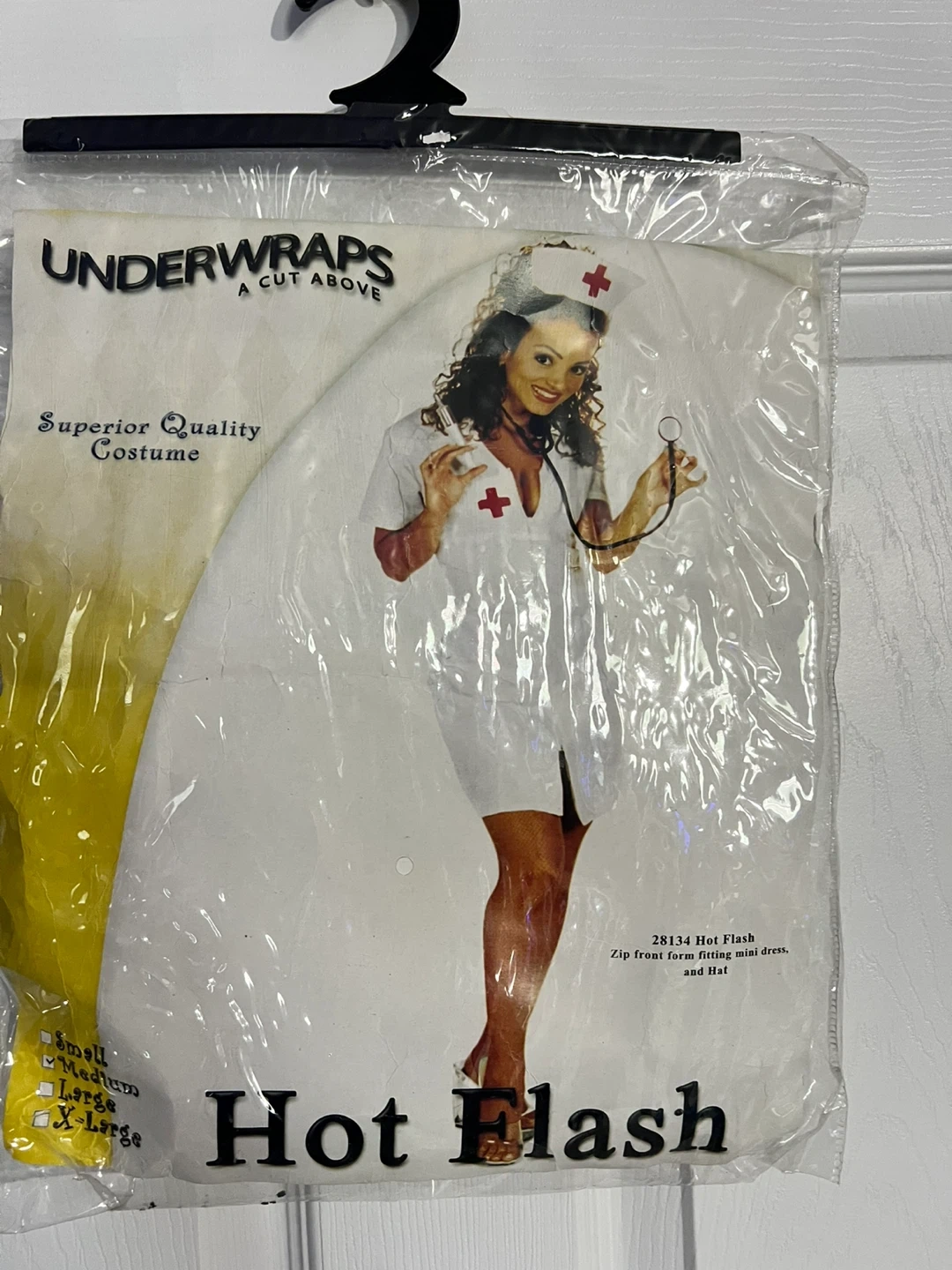 Selling an Underwraps Hot Flash nurse costume in size medium! It's a superior quality costume that includes a zip front form fitting mini dress and hat. Perfect for costume parties or Halloween!