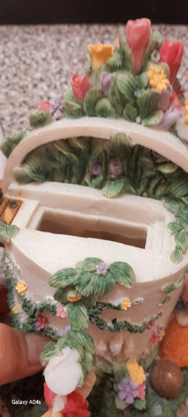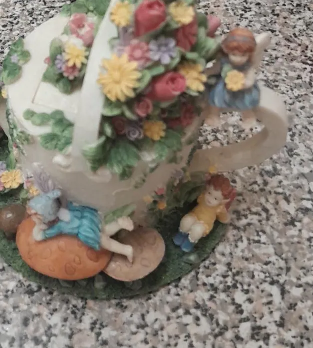 A beautiful floral fairy figurine! It has a lovely arrangement of flowers and cute little fairies. It would be a great addition to any collection or a sweet decorative piece for your home