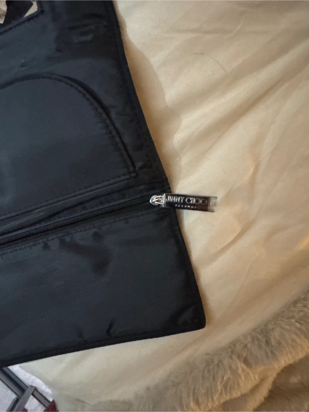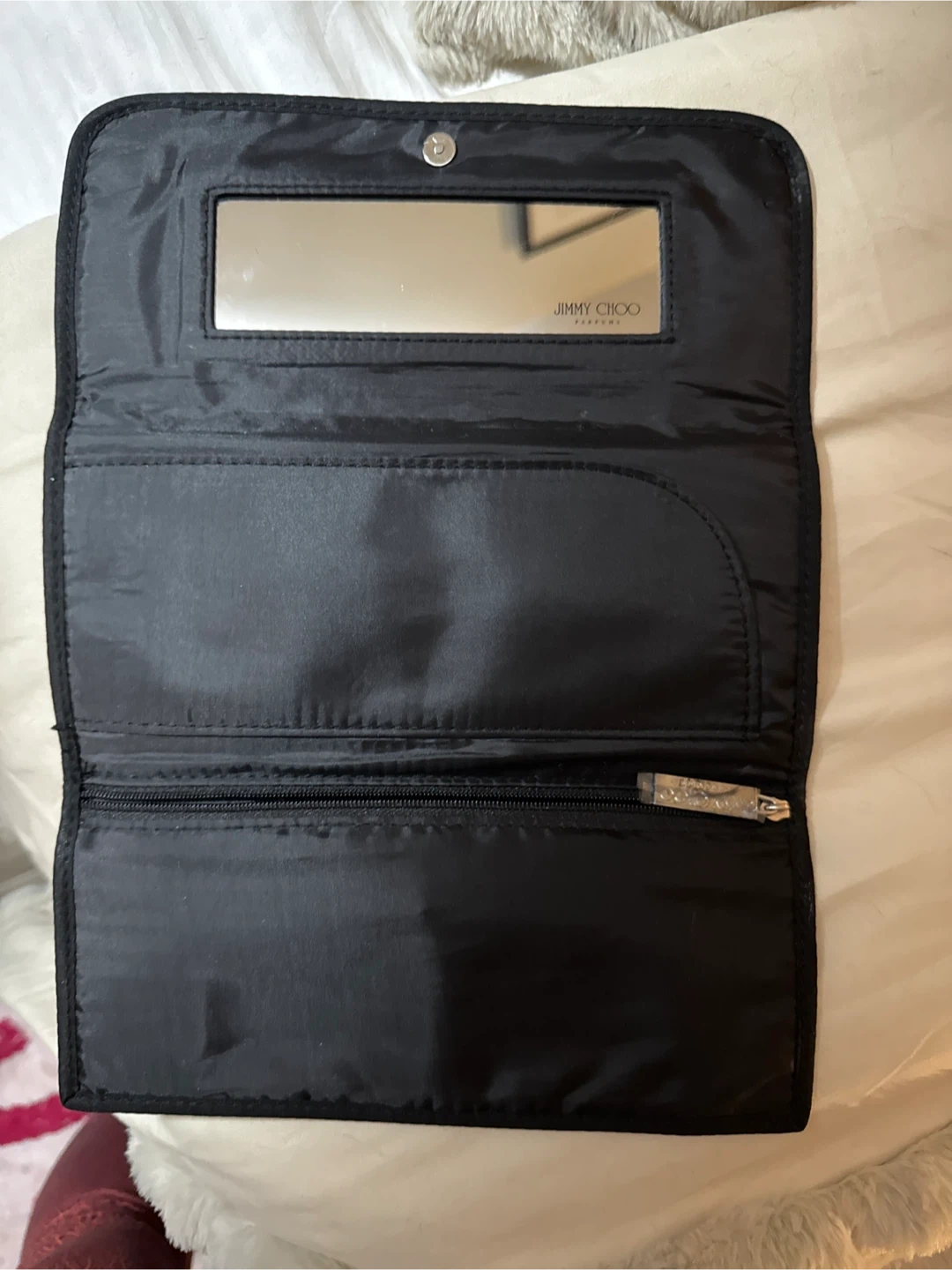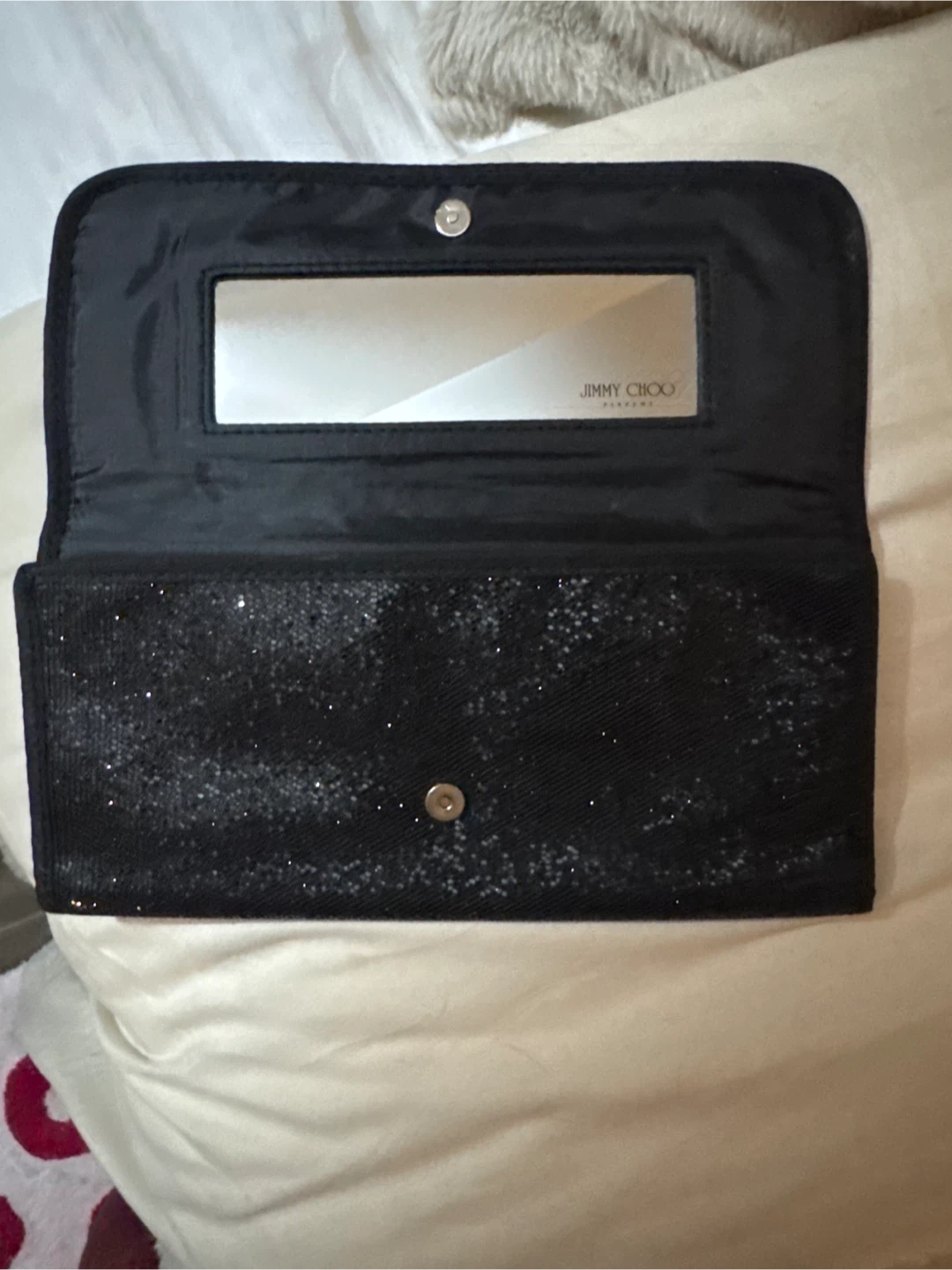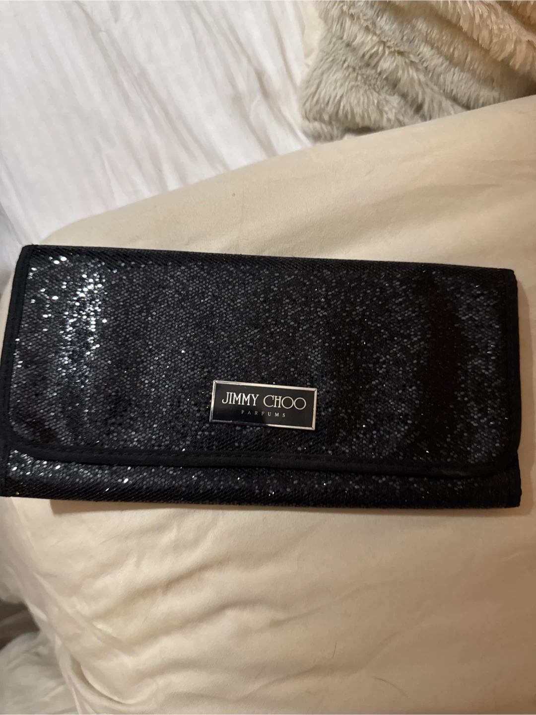 Selling a Jimmy Choo cosmetic bag or can be used as a clutch also. It's black and has a glittery exterior. Inside, there's a mirror and a zippered compartment. Great for keeping your makeup or cards organized!