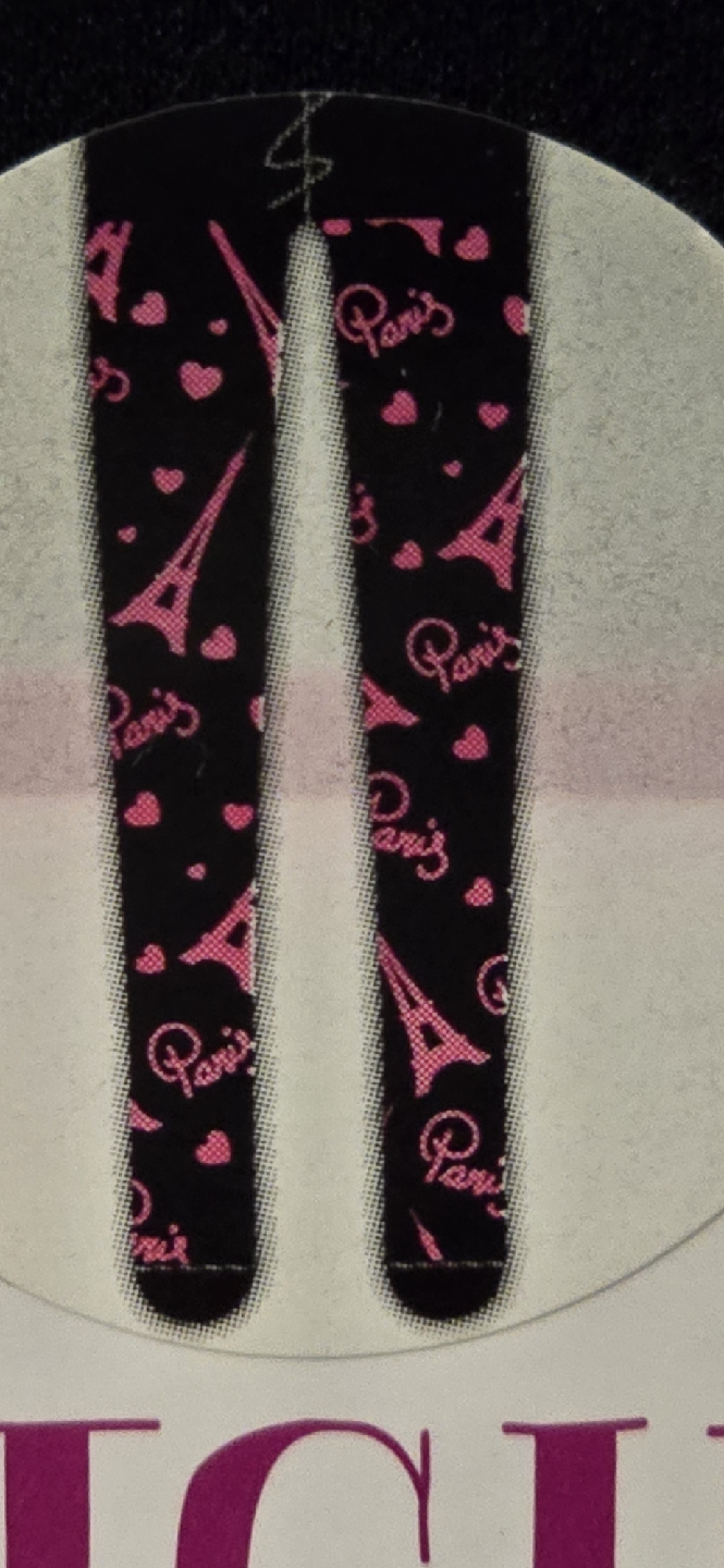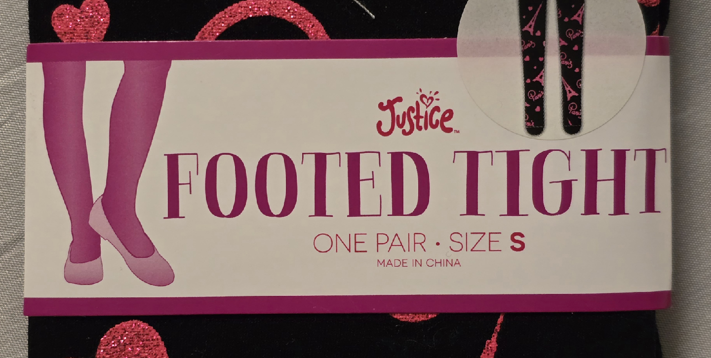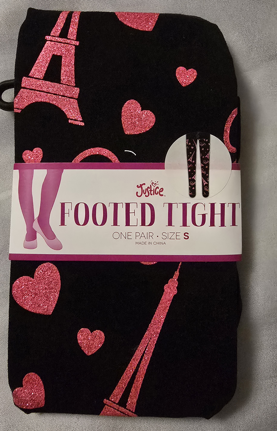 Cute pair of Justice footed tights, brand new in packaging! These are a size small and fits girls 7/8. Features a fun Paris/Eiffel Tower design. Made of 90% nylon and 10% elastane.
