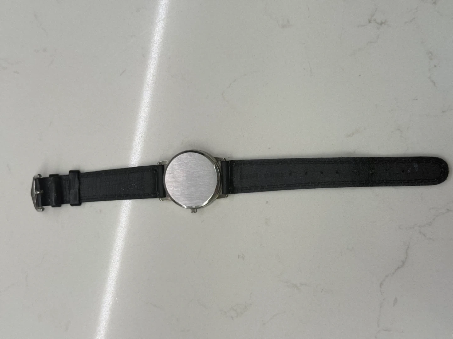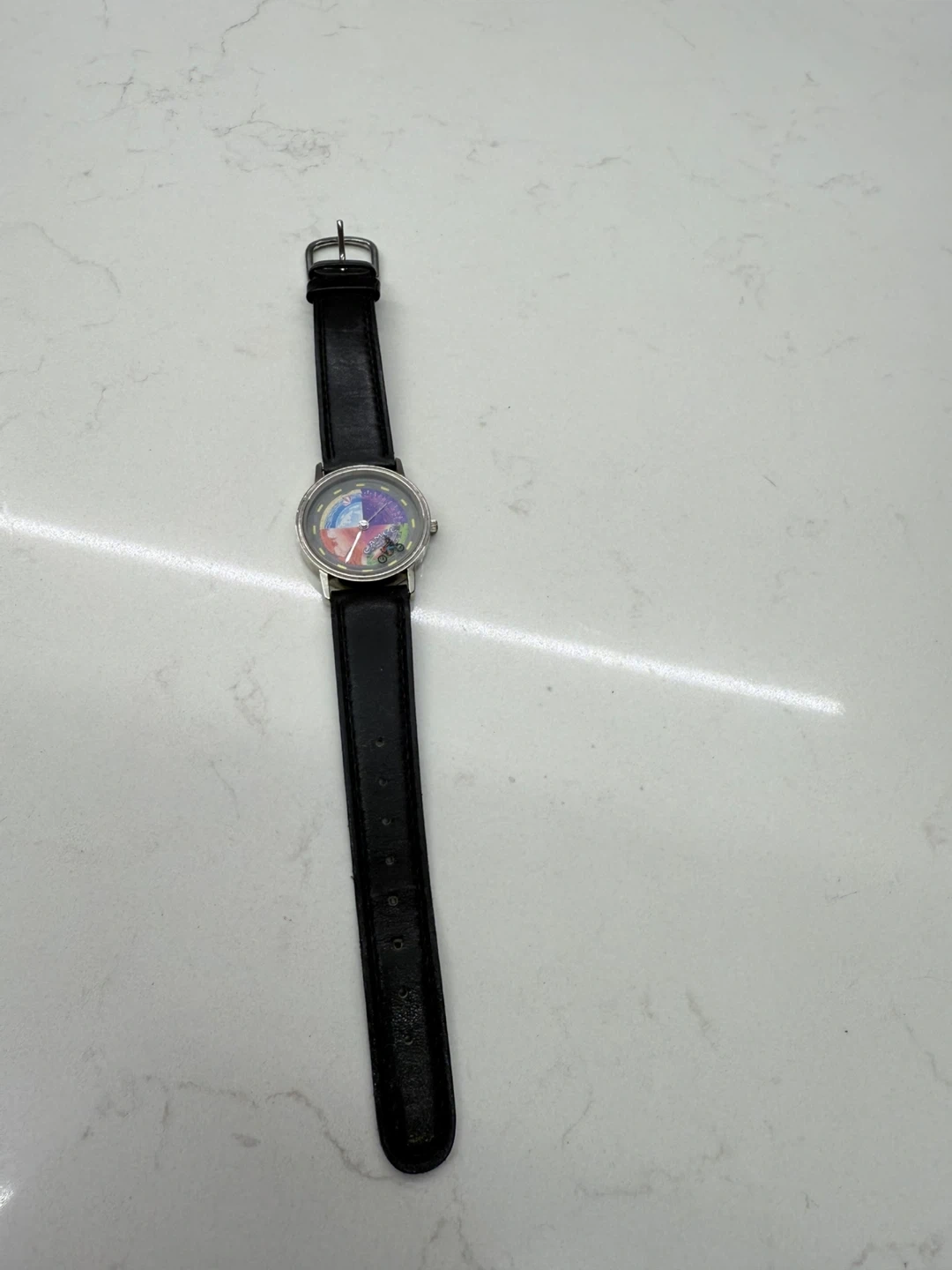 Selling a vintage Camel watch with a black leather band. The watch face has a unique design featuring a motorcycle and colorful segments. The band is in good condition, watch needs new battery!! 🪫 discounted because no battery.