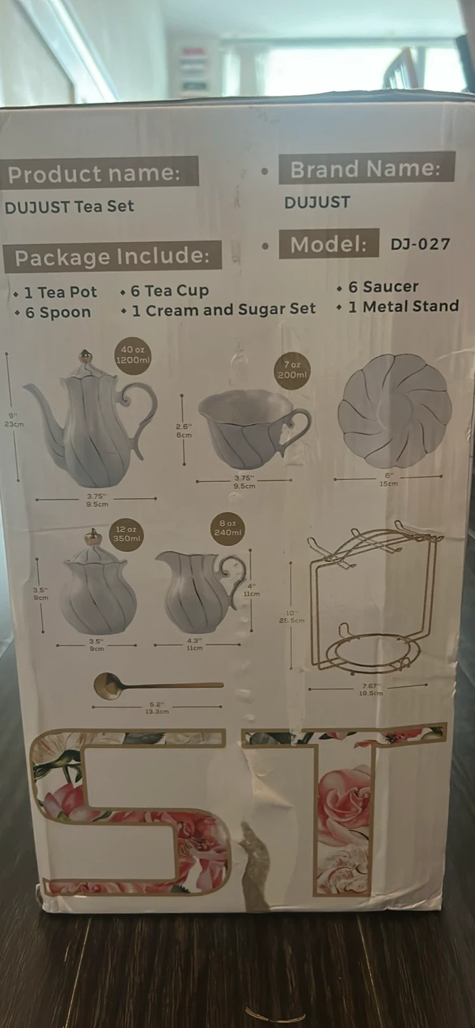 Selling a brand new DUJUST Tea Set, model DJ-027. It's still in its original packaging! The set includes a tea pot, six tea cups, six spoons, a cream and sugar set, six saucers, and a metal stand. Perfect for a tea party!