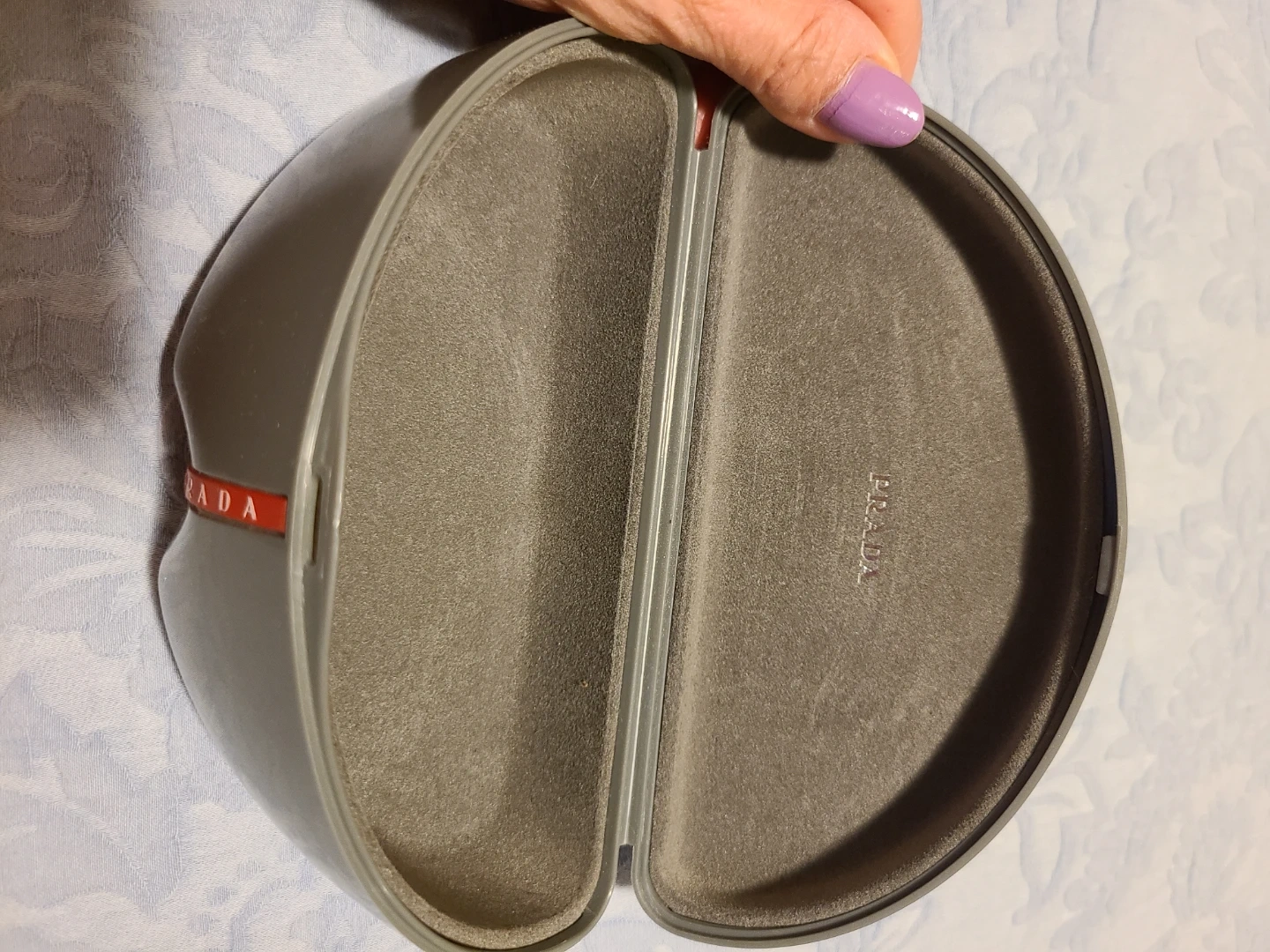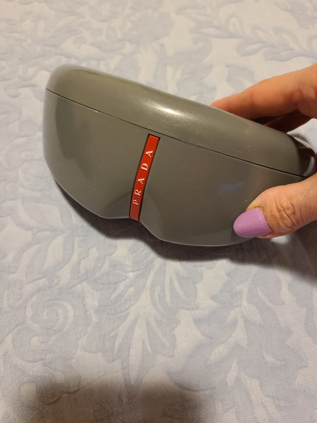 Selling a pair of Prada sunglasses in an aviator style with box. They have a black frame with grey lenses and red accents on the arms. The model number is PS 510 62014 1BO-1A1 135 3N. made in Italy. has damages in the picture.
