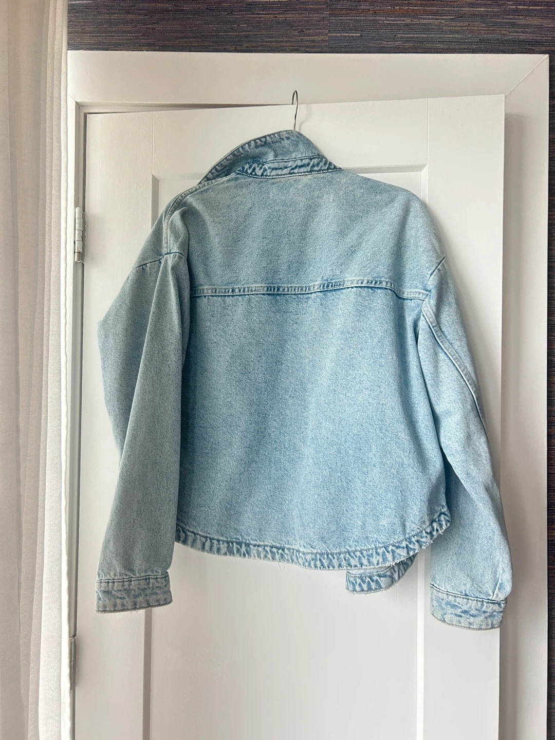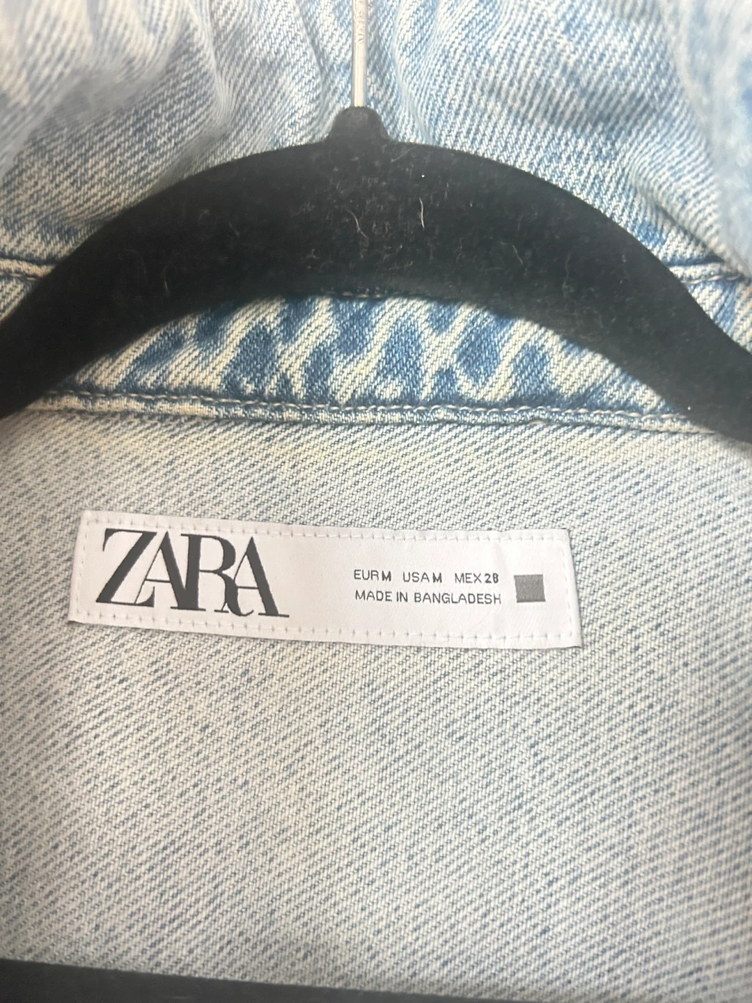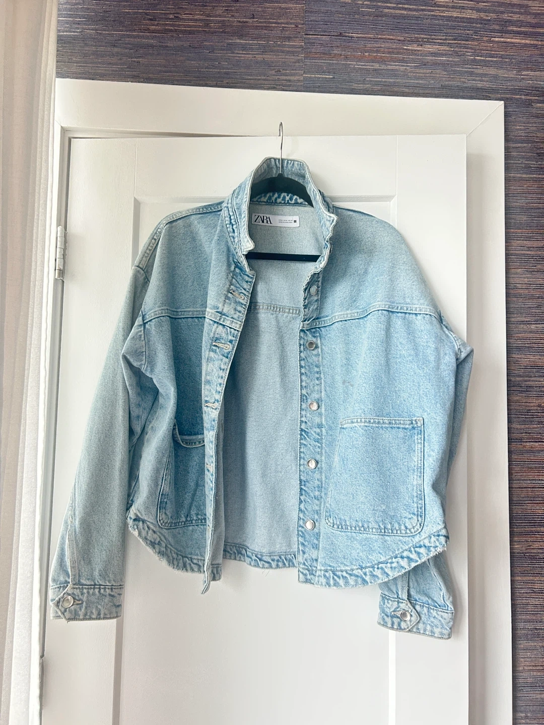 71Selling a Zara denim jacket in size medium. It's in great condition and ready for a new home! The jacket is a light wash denim, perfect for layering or wearing on its own.