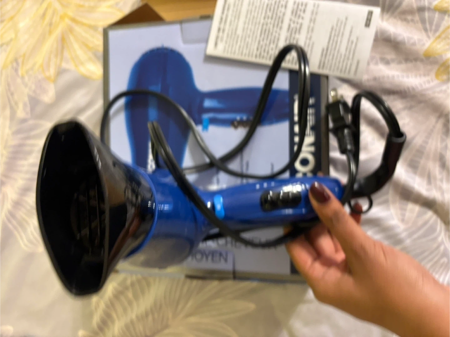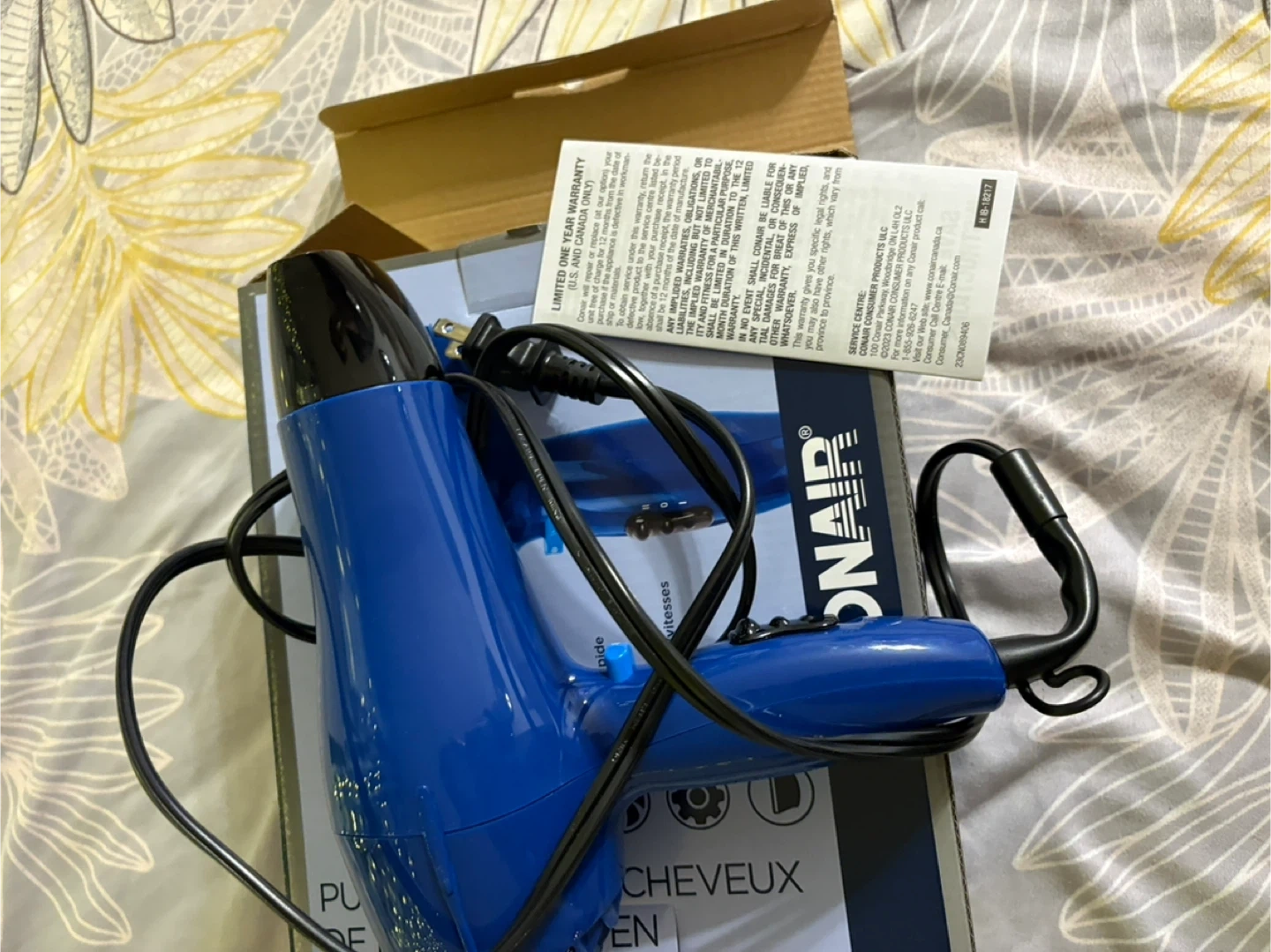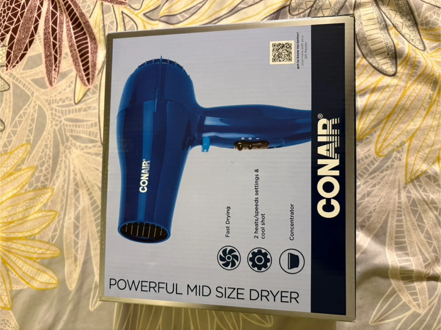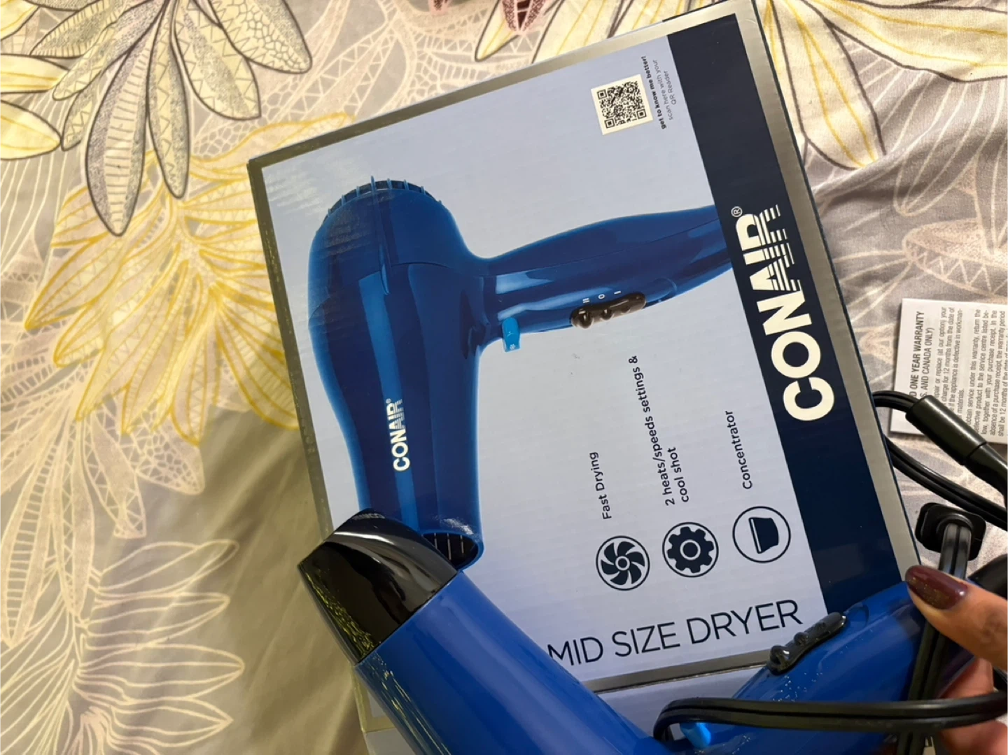 25Selling a Conair powerful mid-size dryer in blue! It has 2 heat/speed settings and a cool shot button. The dryer also comes with a concentrator attachment. The box is included!