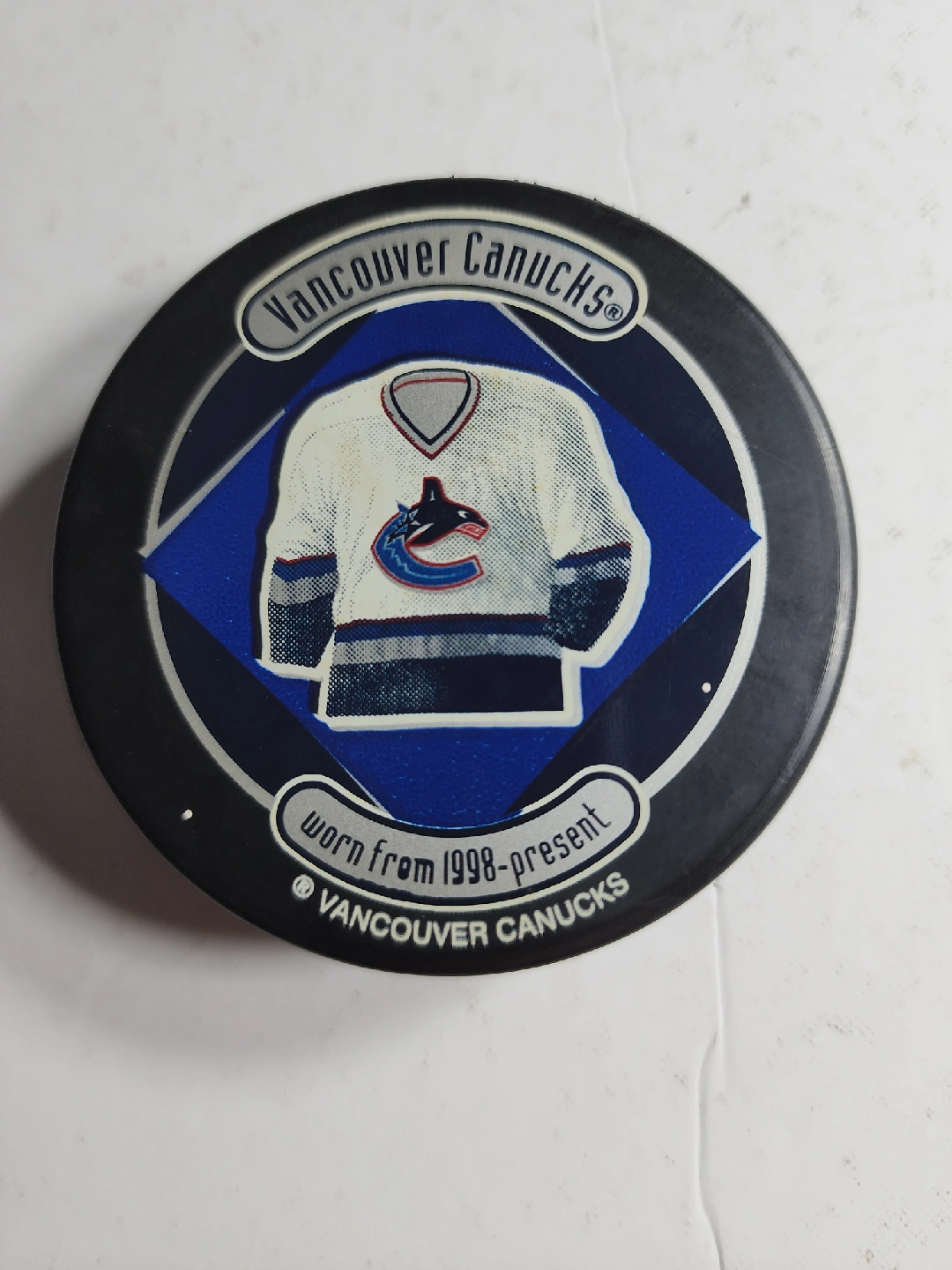 Selling a Vancouver Canucks hockey puck from the Molson Canadian Collectors' Series. It commemorates the 30th anniversary from 1970-2000. It's marked as 1 of 10,000. The reverse side features a Canucks jersey worn from 1998-present. A great piece for any Canucks fan or hockey memorabilia collector!