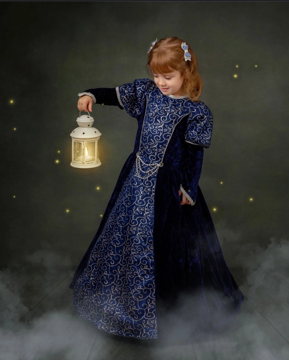156Never used. A beautiful Blue Velvet Dress (Snow Queen Costume) With Cape, 5-6 y.o Perfect for dress-up or special occasions! This dress is size M (5-6 years). It features a lovely design with silver accents, giving it a magical touch. It comes from a smoke-free home and is in great condition!