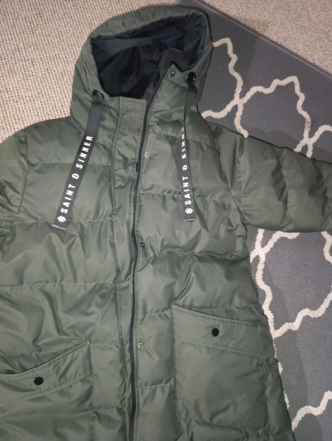 Here's a Saint & Sinner puffer coat in a stylish olive green colour! It's perfect for staying warm during the colder months. The coat features a hood and a zipper closure. It's in great condition and ready for a new home